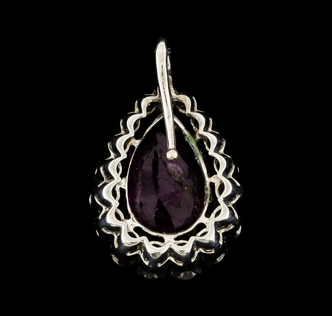 One electronically tested platinum lady's cast drop style pendant with a halo with a bright polish finish. Condition is like new, good workmanship. Containing: One prong set pear modified mixed cut natural pink sapphire, measuring 10.80 x 7.40 x 2.53mm, (depth est.) 5%. bulge factor, approximate weight of 1.70ct., clarity is slightly included, light, moderately strong, slightly purplish red color, (GIA slpR 3/4), cut is good. Transmitting light with a minimum of distortion, transparent. Colored gemstones are presumed to have been subjected to commonly used enhancement processes. Graded in the setting. Seventeen prong set single cut diamonds, measuring 2.20 - 1.70 x 1.21mm (depth est.) approximate total weight of 17 Stones = 0.50ct. Graded in the setting. Clarity VS-1 to VS-2. Color: G - H Cut Good. Total Weight of Colored Stones 1.70ct.. Total Weight of Diamonds 0.50ct.. Total Weight of Pendant 2.30gm. GAS Appraised at $2,590.00.
