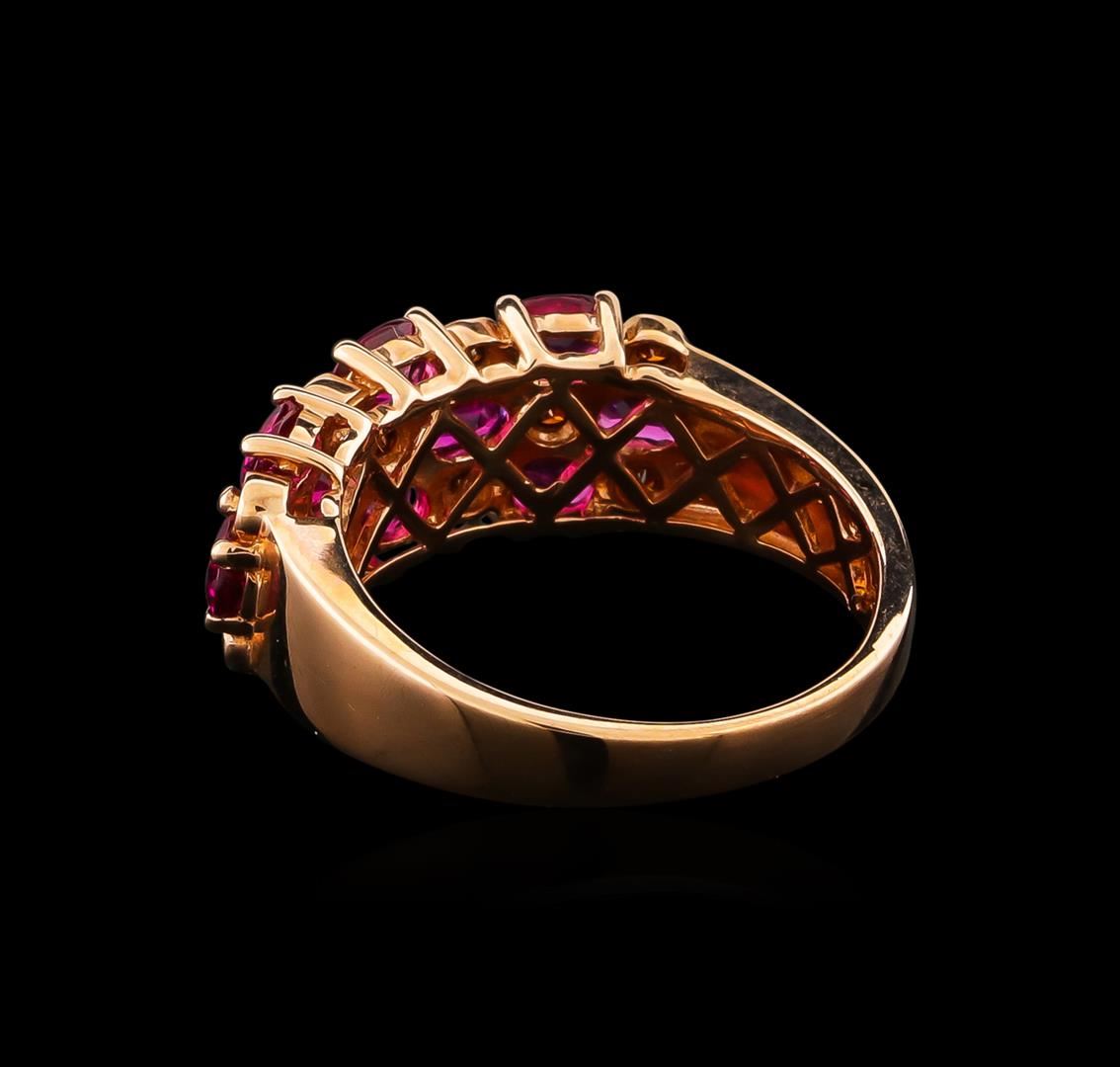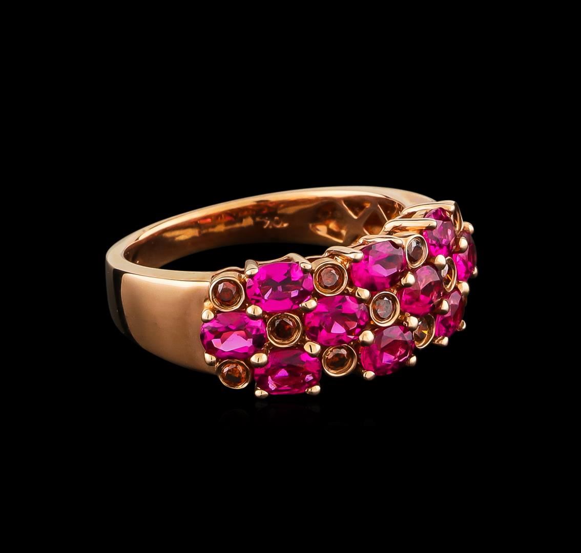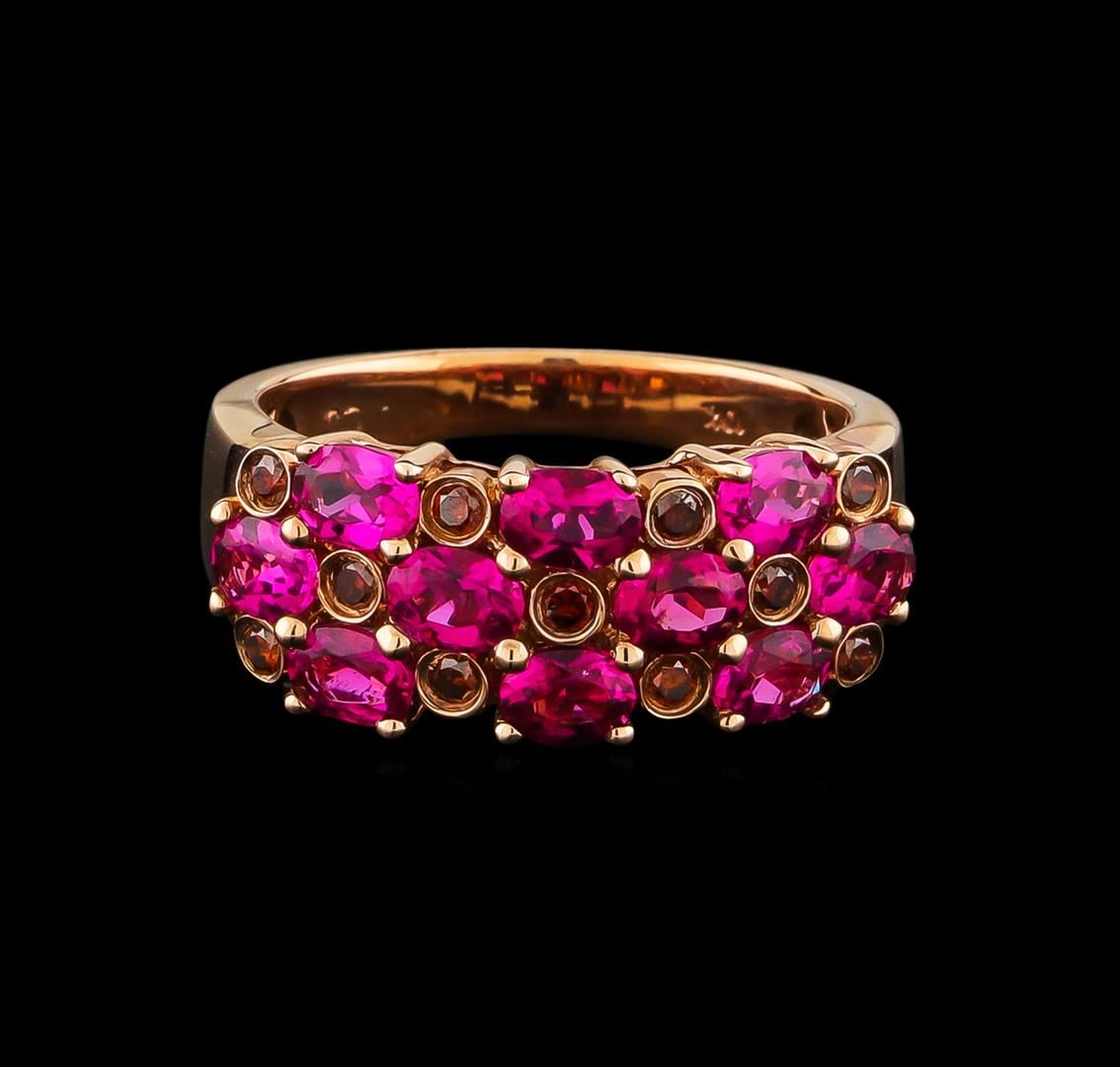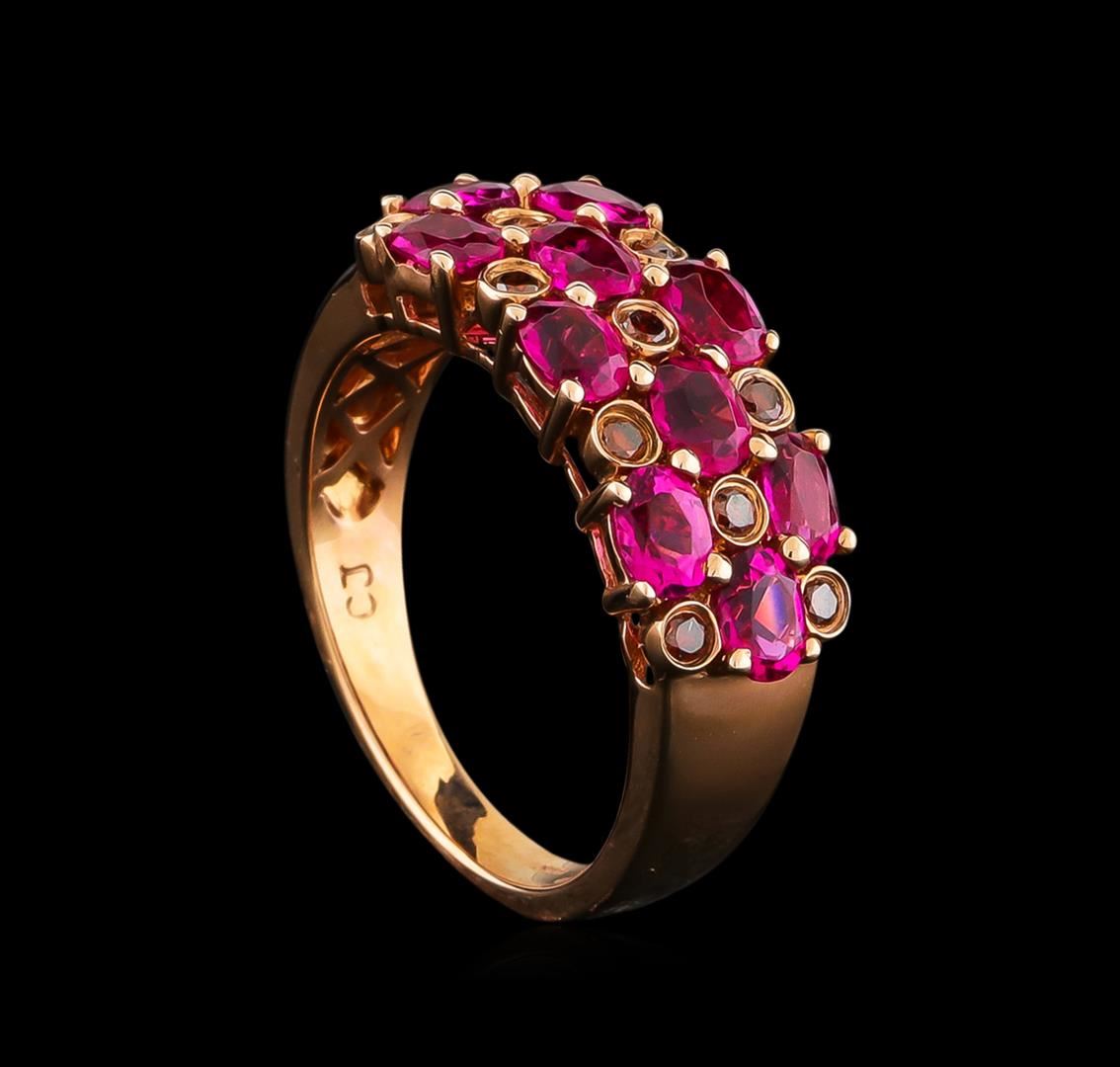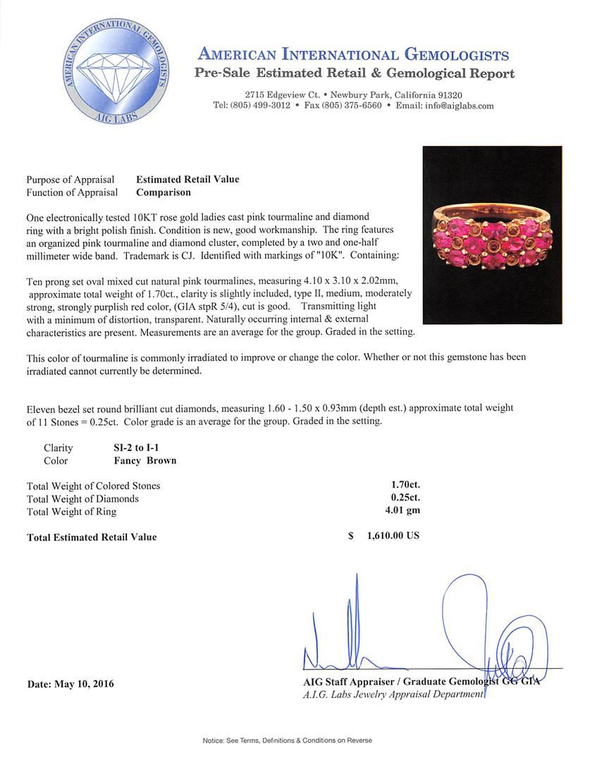 One electronically tested 10KT rose gold ladies cast pink tourmaline and diamond ring with a bright polish finish. The ring features an organized pink tourmaline and diamond cluster, completed by a two and one-half millimeter wide band. Trademark is CJ. Identified with markings of "10K". Condition is new, good workmanship. Containing: Ten prong set oval mixed cut natural pink tourmalines, measuring 4.10 x 3.10 x 2.02mm, approximate total weight of 1.70ct., clarity is slightly included, type II, medium, moderately strong, strongly purplish red color, (GIA stpR 5/4), cut is good. Transmitting light with a minimum of distortion, transparent. Naturally occurring internal & external characteristics are present. Measurements are an average for the group. Graded in the setting. This color of tourmaline is commonly irradiated to improve or change the color. Whether or not this gemstone has been irradiated cannot currently be determined. Eleven bezel set round brilliant cut diamonds, measuring 1.60 - 1.50 x 0.93mm (depth est.) approximate total weight of 11 Stones = 0.25ct. Color grade is an average for the group. Graded in the setting. Clarity: SI-2 to I-1. Total Weight of Colored Stones 1.70ct. Total Weight of Diamonds 0.25ct. Total Weight of Ring 4.01gm. AIG Appraised at $1,610.00.
