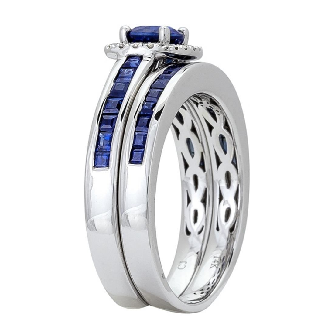 One Ring : 14KT white gold weighing 6.41gm containing one blue sapphire center stone with a total weight of 0.57ct, 32 blue sapphire stones weighing 1.13ctw, and side diamonds weighing 0.10ctw.