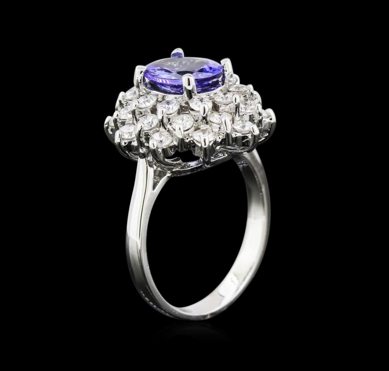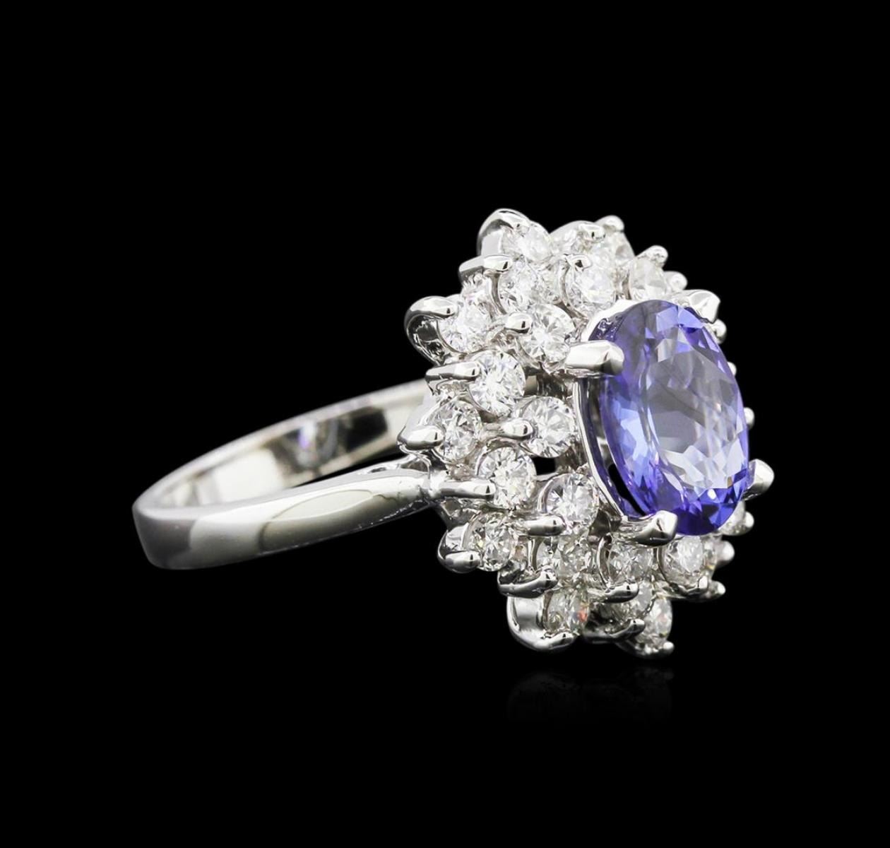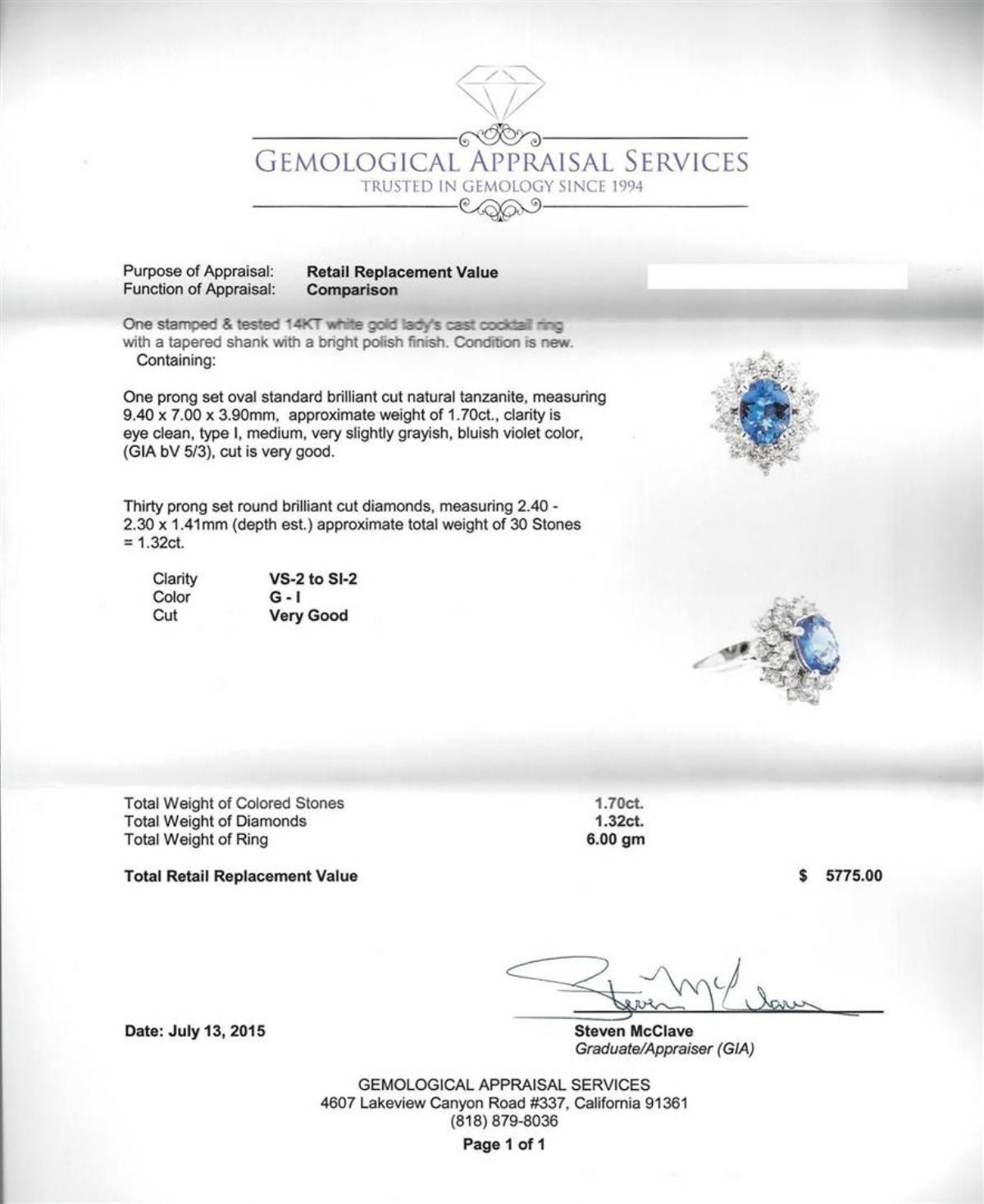 One stamped & tested 14KT white gold lady's cast cocktail ring with a tapered shank with a bright polish finish. Condition is new. Containing: One prong set oval standard brilliant cut natural tanzanite, measuring 9.40 x 7.00 x 3.90mm, approximate weight of 1.70ct., clarity is eye clean, type I, medium, very slightly grayish, bluish violet color, (GIA bV 5/3), cut is very good. Thirty prong set round brilliant cut diamonds, measuring 2.40 - 2.30 x 1.41mm (depth est.) approximate total weight of 30 Stones = 1.32ct. Clarity: VS-2 to SI-2. Color: G - I. Cut: Very Good. Total Weight of Colored Stones: 1.70ct. Total Weight of Diamonds: 1.32ct. Total Weight of Ring: 6.00 gm. GAS Appraised at $5,775.00.