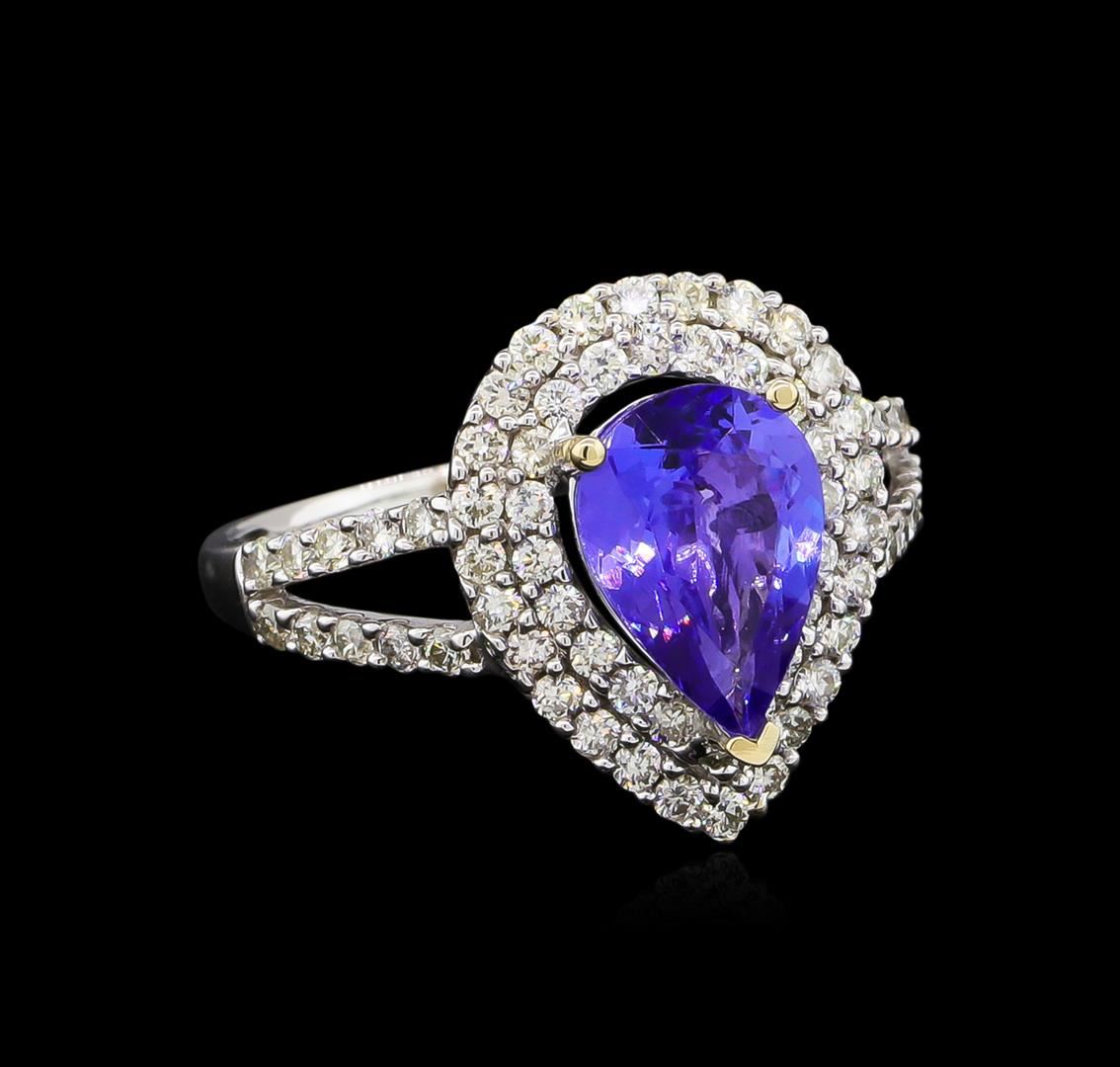 One electronically tested 18KT white gold lady's cast fashion ring with a double basket halo with a bright polish finish. The featured lady's ring has a shank measuring 1.40 millimeters wide. Trademark is Orianne. Identified with markings of "18K". Condition is new, good workmanship. Containing: One prong set pear modified brilliant cut natural tanzanite, measuring 10.01 x 6.90 x 3.60mm, approximate weight of 1.70ct., clarity is slightly included, type I, medium, moderately strong, bluish violet color, (GIA bV 5/4), cut is good. Transmitting light with no distortion, transparent. Colored gemstones are presumed to have been subjected to commonly used enhancement processes. Graded in the setting. Sixty-Six prong set round brilliant cut diamonds, measuring 1.50 - 1.40 x 0.90mm (depth est.) approximate total weight of 66 Stones = 0.78ct. Graded in the setting. Clarity: SI-1 to SI-2. Color: H - I. Cut Good. Total Weight of Colored Stones 1.70ct. Total Weight of Diamonds 0.78ct. Total Weight of Ring 4.00gm. GAS Appraised at $4,785.00.