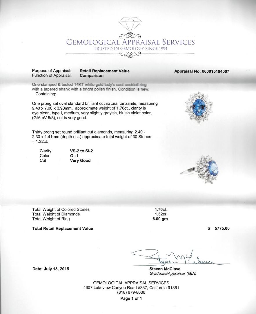 One stamped & tested 14KT white gold lady's cast cocktail ring with a tapered shank with a bright polish finish. Condition is new. Containing: One prong set oval standard brilliant cut natural tanzanite, measuring 9.40 x 7.00 x 3.90mm, approximate weight of 1.70ct., clarity is eye clean, type I, medium, very slightly grayish, bluish violet color, (GIA bV 5/3), cut is very good. Thirty prong set round brilliant cut diamonds, measuring 2.40 - 2.30 x 1.41mm (depth est.) approximate total weight of 30 Stones = 1.32ct. Clarity: VS-2 to SI-2. Color: G - I. Cut: Very Good. Total Weight of Colored Stones: 1.70ct. Total Weight of Diamonds: 1.32ct. Total Weight of Ring: 6.00 gm. GAS Appraised at $5,775.00.