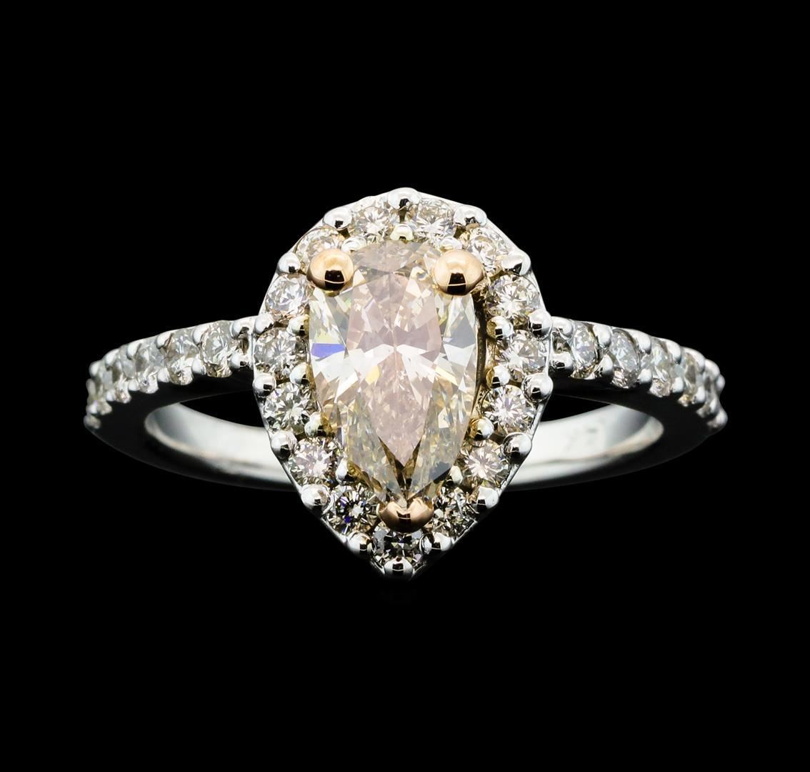 One electronically tested 14KT rose and white gold lady's combination cast & assembled wedding ring with a cathedral halo with a bright polish finish. The featured lady's ring has a shank measuring 1.94 millimeters wide. Identified with markings of '14K'. Condition is new, good workmanship. Containing: One prong set pear shaped cut diamond, measuring 9.00 x 5.35 x 3.50mm (depth est.) , 10.00.%. GTCF approximate weight of 1.09ct. Graded in the setting. Clarity SI-2 Cut Very Good Twenty-Six prong set round brilliant cut diamonds, measuring 1.90 - 1.80 x 1.15mm (depth est.) approximate total weight of 26 Stones = 0.62ct. Graded in the setting. Clarity SI-1 to SI-2. Color: H - I Cut Very Good. Total Weight of Diamonds 1.71ct.. Total Weight of Ring 4.40gm. GAS Appraised.