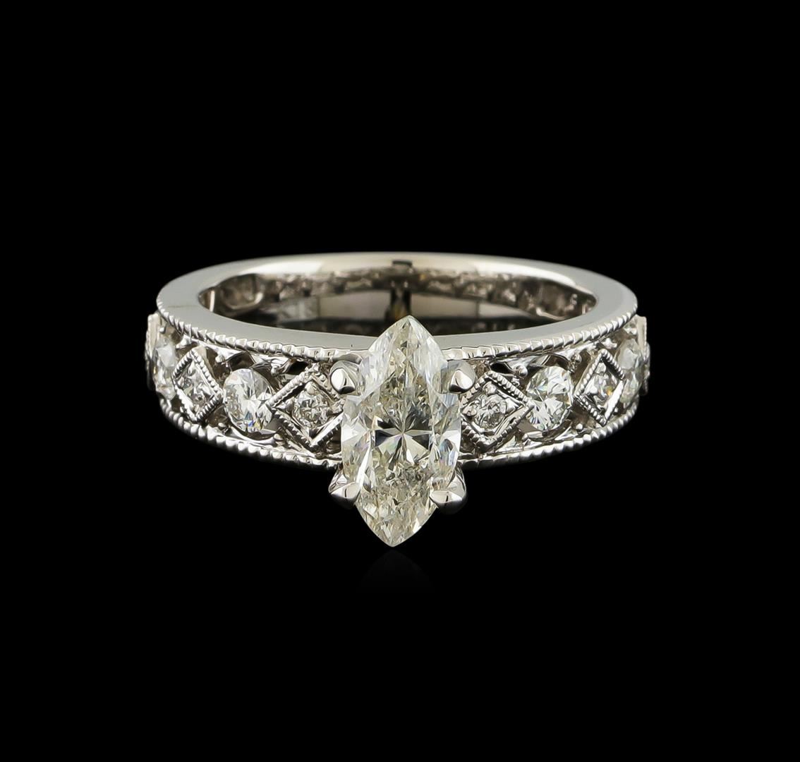 One electronically tested 18KT white gold lady's cast wedding ring with a bright polish with milgrain detailing finish. The featured lady's ring has a shank measuring 4.45 millimeters wide. Identified with markings of "K18". Condition is new, good workmanship. Containing: One prong set marquise shaped cut diamond, measuring 10.07 x 5.06 x 3.54mm (depth est.) , 10.00.%. GTCF approximate weight of 1.16ct. Graded in the setting. Clarity: I-1. Color: H - I. Cut Good Six prong set round brilliant cut diamonds, measuring 2.90 - 2.70 x 1.68mm (depth est.) approximate total weight of 6 Stones = 0.48ct. Graded in the setting. Clarity: VS-2 to SI-1. Color: G - Excellent Eight prong set round brilliant cut diamonds, measuring 1.40 - 1.30 x 0.81mm (depth est.) approximate total weight of 8 Stones = 0.07ct. Graded in the setting. Clarity: SI-1 to I-1. Color: G - Good. Total Weight of Diamonds 1.71ct. Total Weight of Ring 6.50gm GAS Appraised at $10,315.00.