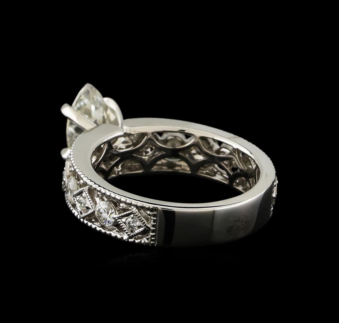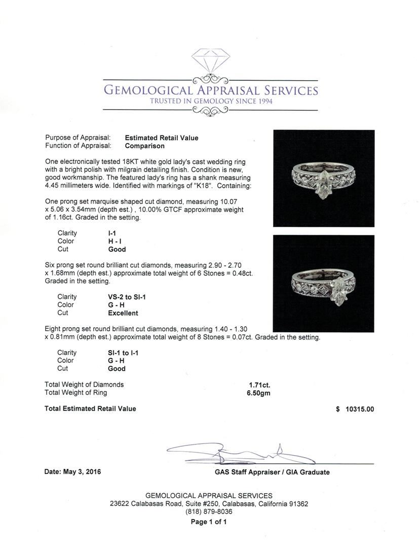 One electronically tested 18KT white gold lady's cast wedding ring with a bright polish with milgrain detailing finish. The featured lady's ring has a shank measuring 4.45 millimeters wide. Identified with markings of "K18". Condition is new, good workmanship. Containing: One prong set marquise shaped cut diamond, measuring 10.07 x 5.06 x 3.54mm (depth est.) , 10.00.%. GTCF approximate weight of 1.16ct. Graded in the setting. Clarity: I-1. Color: H - I. Cut Good Six prong set round brilliant cut diamonds, measuring 2.90 - 2.70 x 1.68mm (depth est.) approximate total weight of 6 Stones = 0.48ct. Graded in the setting. Clarity: VS-2 to SI-1. Color: G - Excellent Eight prong set round brilliant cut diamonds, measuring 1.40 - 1.30 x 0.81mm (depth est.) approximate total weight of 8 Stones = 0.07ct. Graded in the setting. Clarity: SI-1 to I-1. Color: G - Good. Total Weight of Diamonds 1.71ct. Total Weight of Ring 6.50gm GAS Appraised at $10,315.00.