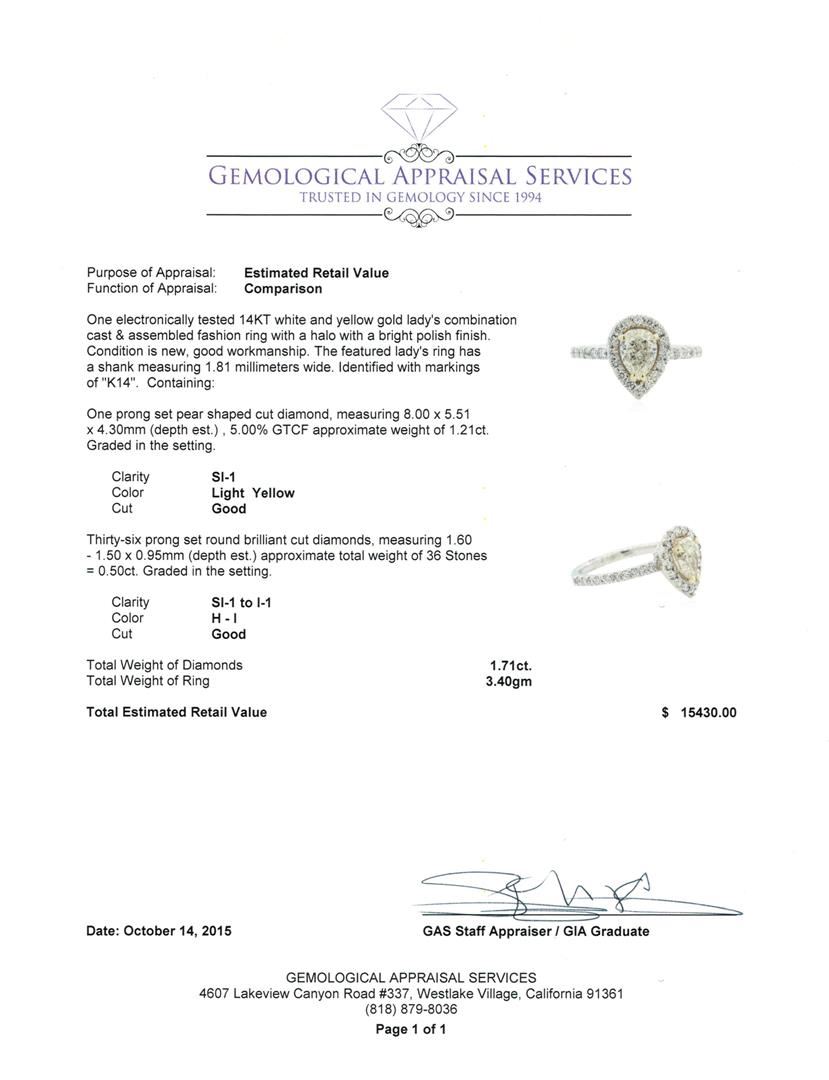 One electronically tested 14KT white and yellow gold lady's combination cast & assembled fashion ring with a halo with a bright polish finish. The featured lady's ring has a shank measuring 1.81 millimeters wide. Identified with markings of "K14". Condition is new, good workmanship. Containing: One prong set pear shaped cut diamond, measuring 8.00 x 5.51 x 4.30mm (depth est.) , 5.00% GTCF approximate weight of 1.21ct. Graded in the setting. Clarity: SI-1 Cut Good Thirty-Six prong set round brilliant cut diamonds, measuring 1.60 - 1.50 x 0.95mm (depth est.) approximate total weight of 36 Stones = 0.50ct. Graded in the setting. Clarity: SI-1 to I-1. Color: H - I. Cut Good. Total Weight of Diamonds 1.71ct. Total Weight of Ring 3.40gm. GAS Appraised at $15,430.00.