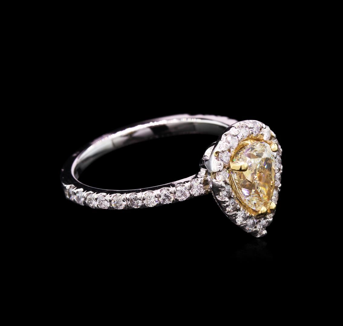 One electronically tested 14KT white and yellow gold lady's combination cast & assembled fashion ring with a halo with a bright polish finish. The featured lady's ring has a shank measuring 1.81 millimeters wide. Identified with markings of "K14". Condition is new, good workmanship. Containing: One prong set pear shaped cut diamond, measuring 8.00 x 5.51 x 4.30mm (depth est.) , 5.00% GTCF approximate weight of 1.21ct. Graded in the setting. Clarity: SI-1 Cut Good Thirty-Six prong set round brilliant cut diamonds, measuring 1.60 - 1.50 x 0.95mm (depth est.) approximate total weight of 36 Stones = 0.50ct. Graded in the setting. Clarity: SI-1 to I-1. Color: H - I. Cut Good. Total Weight of Diamonds 1.71ct. Total Weight of Ring 3.40gm. GAS Appraised at $15,430.00.