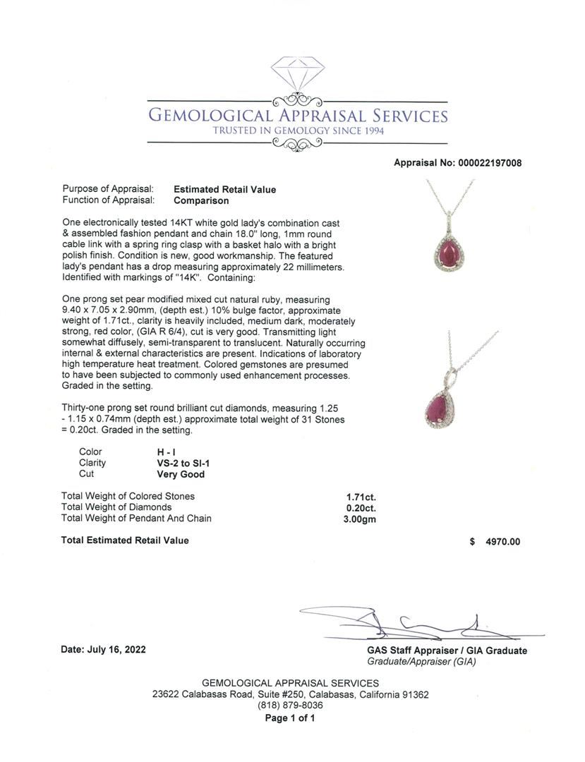 One electronically tested 14KT white gold lady's combination cast & assembled fashion pendant and chain 18.0" long, 1mm round cable link with a spring ring clasp with a basket halo with a bright polish finish. Condition is new, good workmanship. The featu