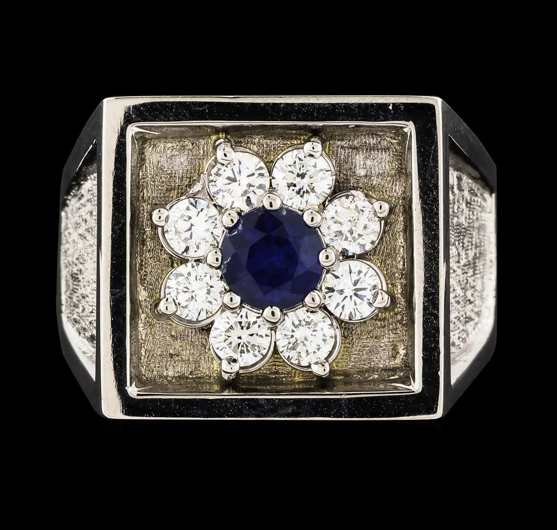One electronically tested 14KT white gold man's cast fashion ring with a tapered shank with a bright polish and satin finish. The featured man's ring has a center sapphire starburst motif set below a raised square edge and a shank measuring 3.62 millimeters wide. Identified with markings of '14K'. Condition is like new, good workmanship. Containing: One prong set round modified brilliant cut natural blue sapphire, measuring 5.40 - 5.35 x 3.92 mm, (depth est.) approximate weight of 0.91ct., clarity is slightly included, medium dark, very slightly grayish, blue color, (GIA B 6/3), cut is good. Transmitting light somewhat diffusely, transparent to translucent. Colored gemstones are presumed to have been subjected to commonly used enhancement processes. Graded in the setting. Eight prong set round brilliant cut diamonds, measuring 3.10 - 3.00 x 1.83mm (depth est.) approximate total weight of 8 Stones = 0.80ct. Graded in the setting. Clarity VS-2 to SI-1. Color: H - I Cut Good. Total Weight of Colored Stones 0.91ct.. Total Weight of Diamonds 0.80ct.. Total Weight of Ring 20.30gm. GAS Appraised at $5,130.00.