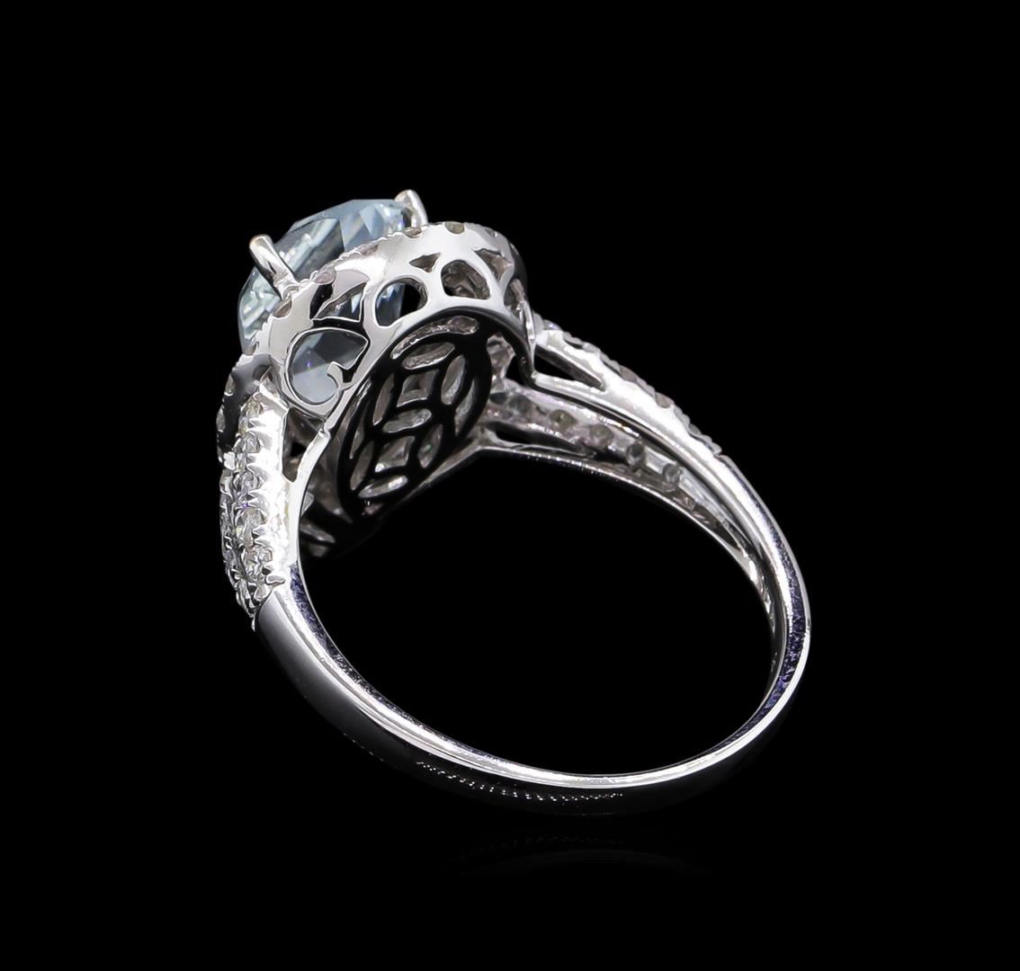 One electronically tested 14KT white gold lady's cast fashion ring with a split shank double halo with a bright polish finish. The featured lady's ring has a shank measuring 1.83 millimeters wide. Trademark is Orianne. Identified with markings of "14K". Condition is new, good workmanship. Containing: One prong set pear modified brilliant cut natural aquamarine, measuring 10.95 x 7.13 x 4.24mm, approximate weight of 1.71ct., clarity is eye clean, type I, light, very slightly grayish, blue color, (GIA B 3/3), cut is good. Transmitting light with no distortion, transparent. Colored gemstones are presumed to have been subjected to commonly used enhancement processes. Graded in the setting. Sixty-Six prong set round brilliant cut diamonds, measuring 1.50 - 1.40 x 0.90mm (depth est.) approximate total weight of 66 Stones = 0.77ct. Graded in the setting. Clarity: SI-2 to I-1. Color: G - Good. Total Weight of Colored Stones 1.71ct. Total Weight of Diamonds 0.77ct. Total Weight of Ring 3.50gm. GAS Appraised at $4,370.00.