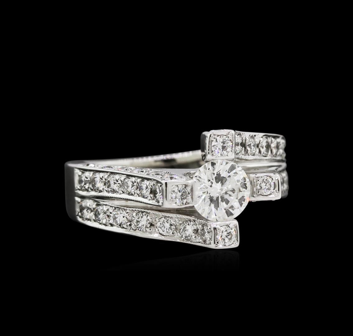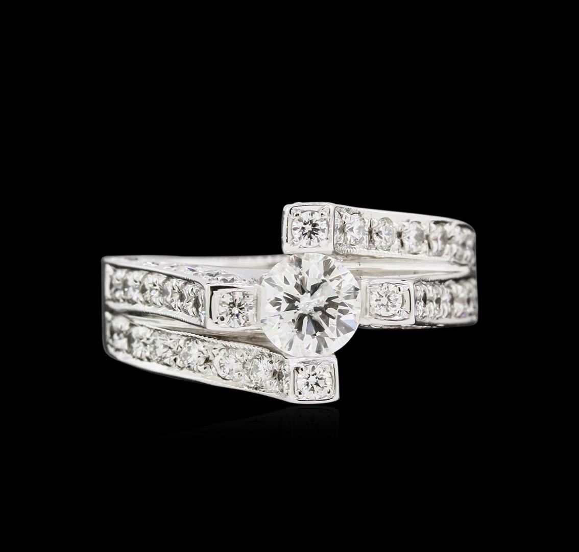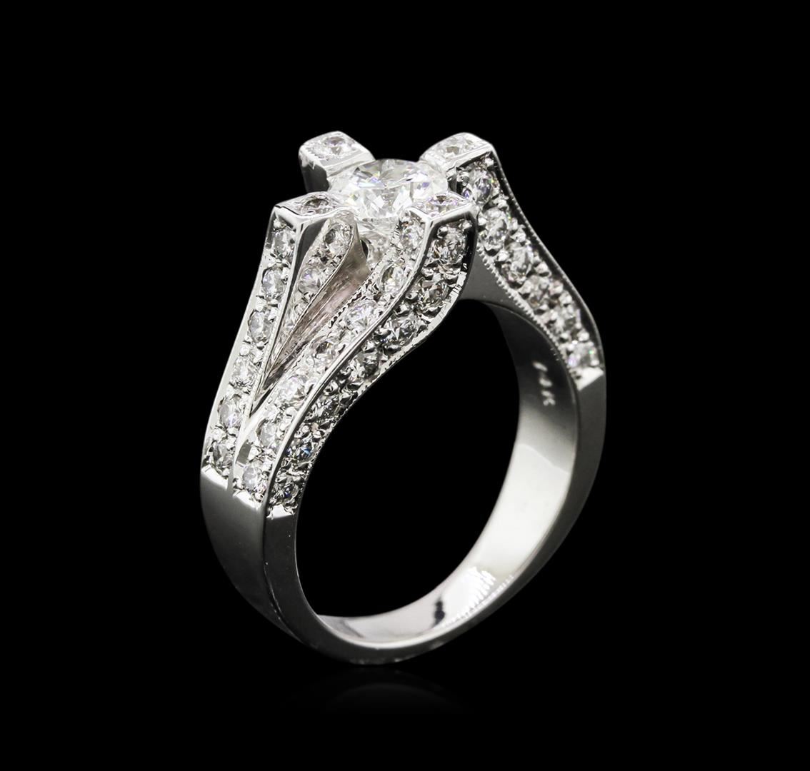 One electronically tested 14KT white gold ladies cast diamond ring. The featured diamond is set within diamond accented prongs supported by elaborate diamond set split shoulders, completed by a three millimeter wide band. Bright polish finish with milgrain detailing. Identified with markings of "14K". Condition is new, good workmanship. Containing: One prong set round brilliant cut diamond, measuring 5.61 - 5.60 x 2.70mm (depth est.) approximate weight of 0.56ct with a medium blue fluorescence. Graded in the setting. Clarity: I-2. Color: 48.1%. Table 58.8%. Fifty-Six bead set round brilliant cut diamonds, measuring 1.90 - 1.60 x 1.05mm (depth est.) approximate total weight of 56 Stones = 1.15ct. Graded in the setting. Clarity: SI-1 to SI-2. Color: G - I. Total Weight of Diamonds 1.71ct. Total Weight of Ring 8.95gm. AIG Appraised at $7,280.00.