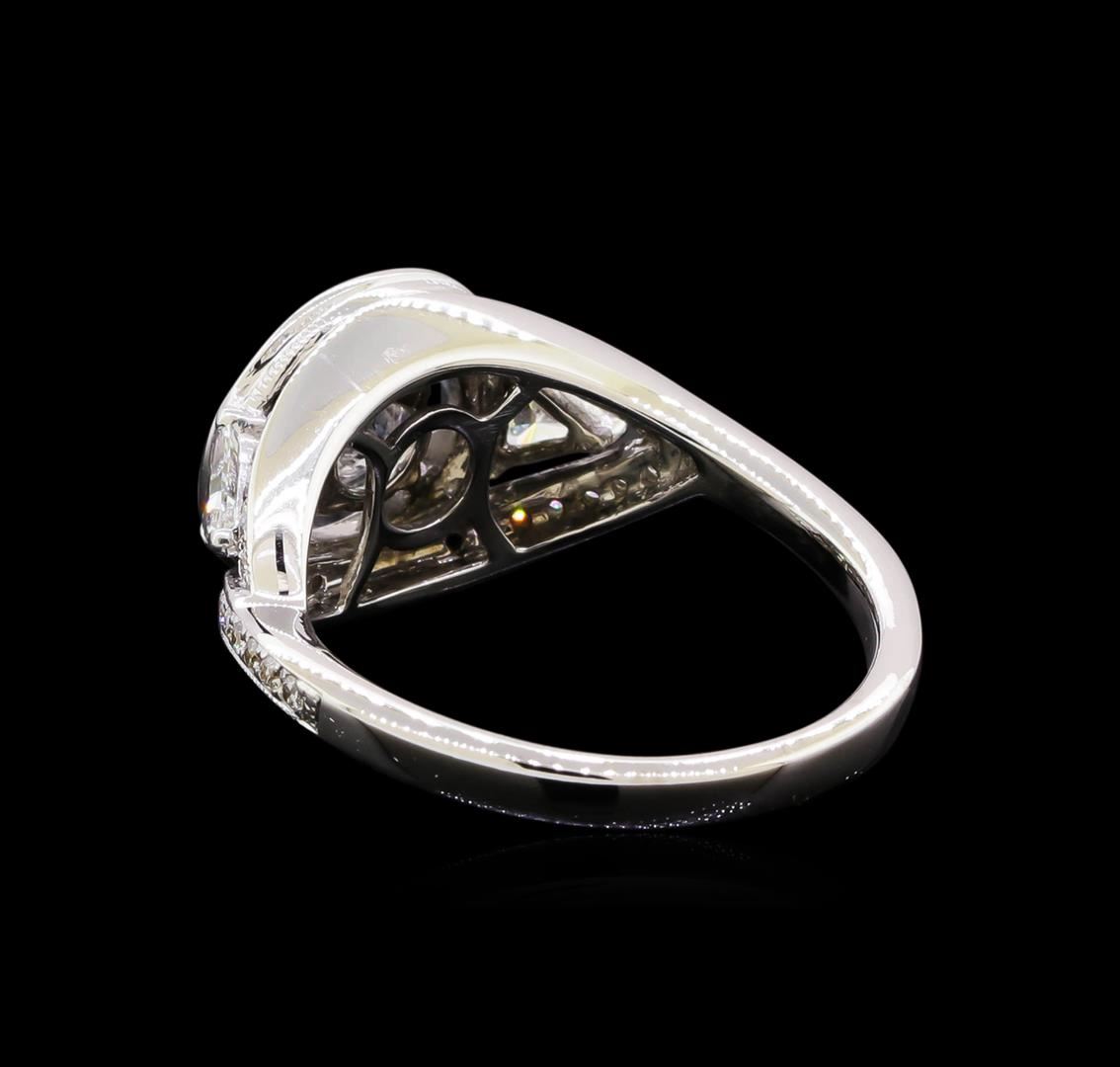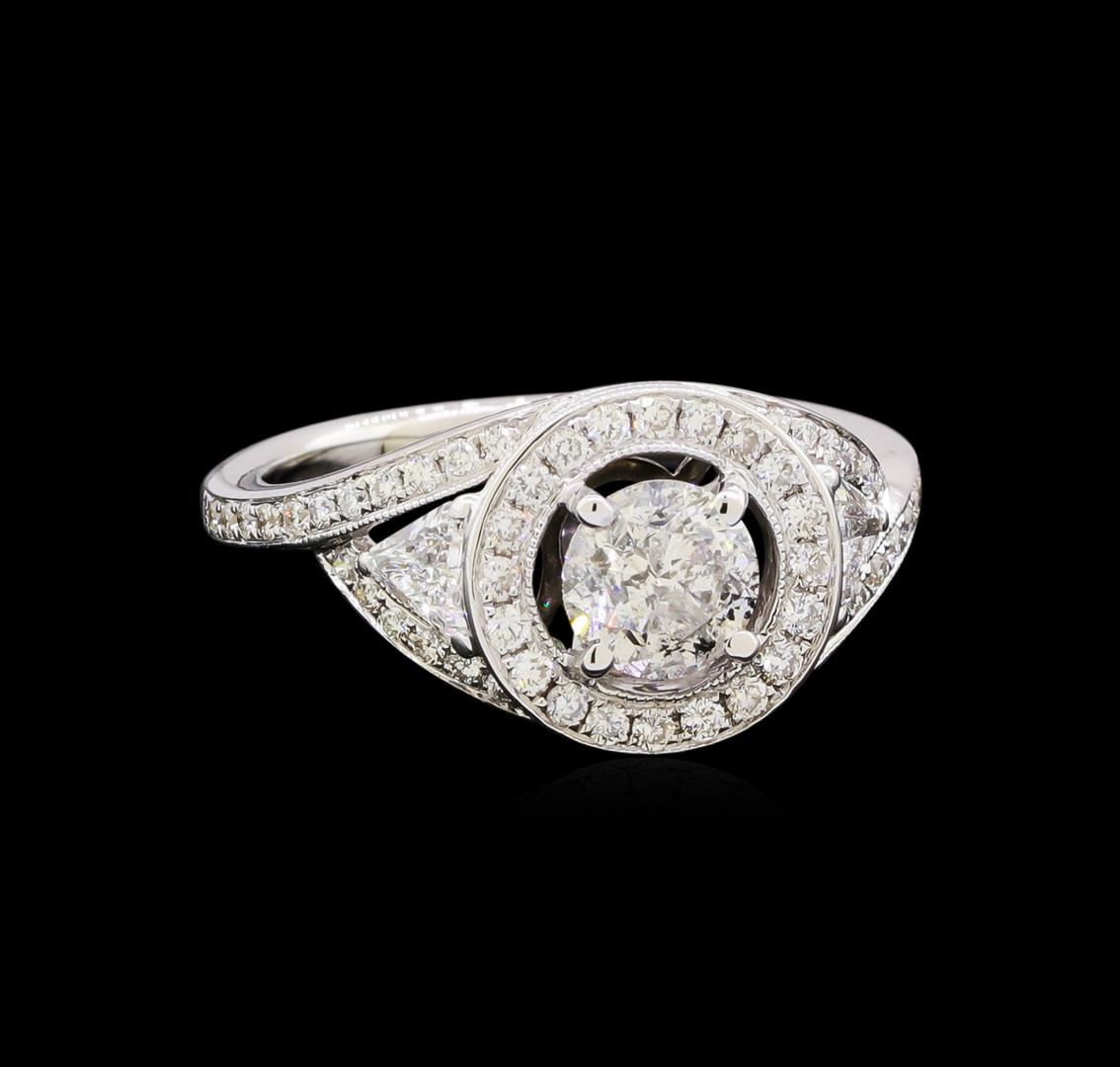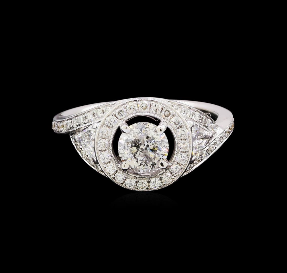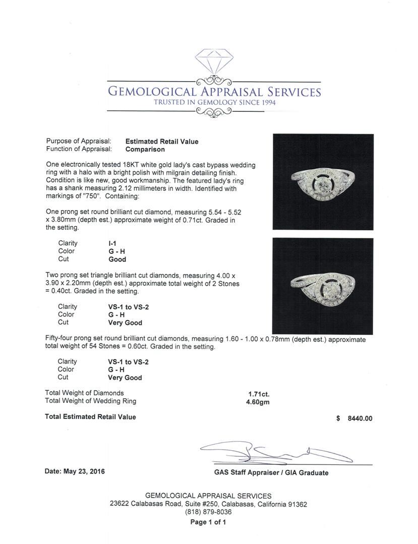 One electronically tested 18KT white gold lady's cast bypass wedding ring with a halo with a bright polish with milgrain detailing finish. The featured lady's ring has a shank measuring 2.12 millimeters in width. Identified with markings of "750". Condition is like new, good workmanship. Containing: One prong set round brilliant cut diamond, measuring 5.54 - 5.52 x 3.80mm (depth est.) approximate weight of 0.71ct. Graded in the setting. Clarity: I-1. Color: G - Good Two prong set triangle brilliant cut diamonds, measuring 4.00 x 3.90 x 2.20mm (depth est.) approximate total weight of 2 Stones = 0.40ct. Graded in the setting. Clarity: VS-1 to VS-2. Color: G - Very Good Fifty-Four prong set round brilliant cut diamonds, measuring 1.60 - 1.00 x 0.78mm (depth est.) approximate total weight of 54 Stones = 0.60ct. Graded in the setting. Clarity: VS-1 to VS-2. Color: G - Very Good. Total Weight of Diamonds 1.71ct. Total Weight of Wedding Ring 4.60gm. GAS Appraised at $8,440.00.