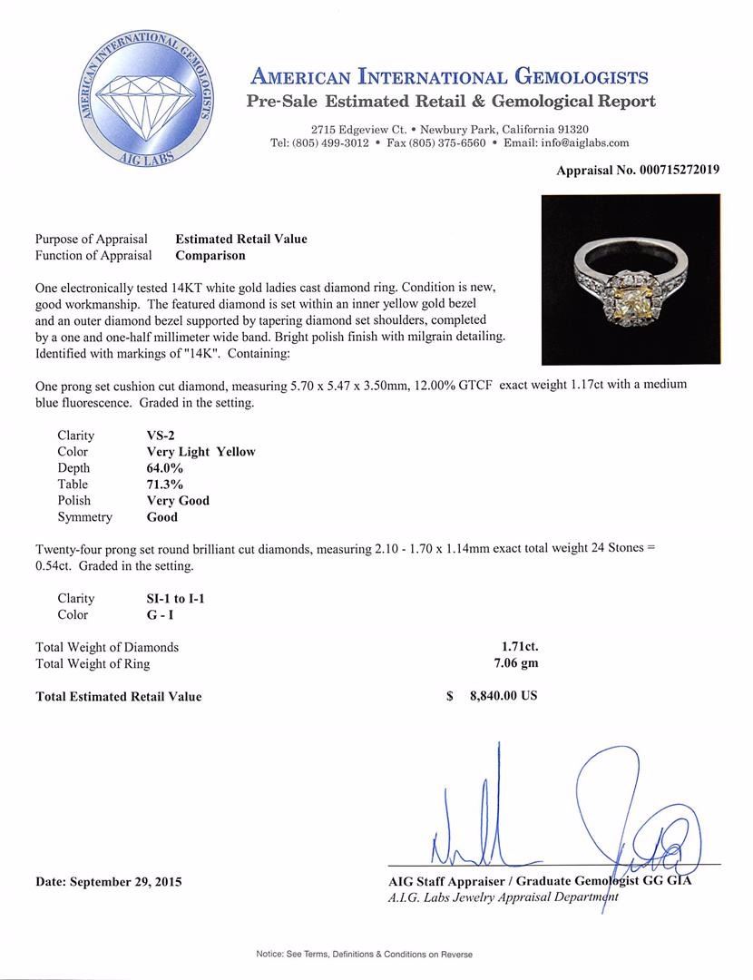 One electronically tested 14KT white gold ladies cast diamond ring. The featured diamond is set within an inner yellow gold bezel and an outer diamond bezel supported by tapering diamond set shoulders, completed by a one and one-half millimeter wide band. Bright polish finish with milgrain detailing. Identified with markings of "14K". Condition is new, good workmanship. Containing: One prong set cushion cut diamond, measuring 5.70 x 5.47 x 3.50mm, 12.00.%. GTCF exact weight 1.17ct with a medium blue fluorescence. Graded in the setting. Clarity: VS-2. Depth: 64.0%. Table 71.3%. Twenty-Four prong set round brilliant cut diamonds, measuring 2.10 - 1.70 x 1.14mm exact total weight 24 Stones = 0.54ct. Graded in the setting. Clarity: SI-1 to I-1. Color: G - I. Total Weight of Diamonds 1.71ct. Total Weight of Ring 7.06gm. AIG Appraised at $8,840.00.