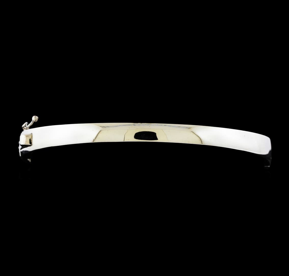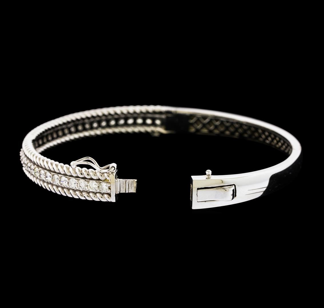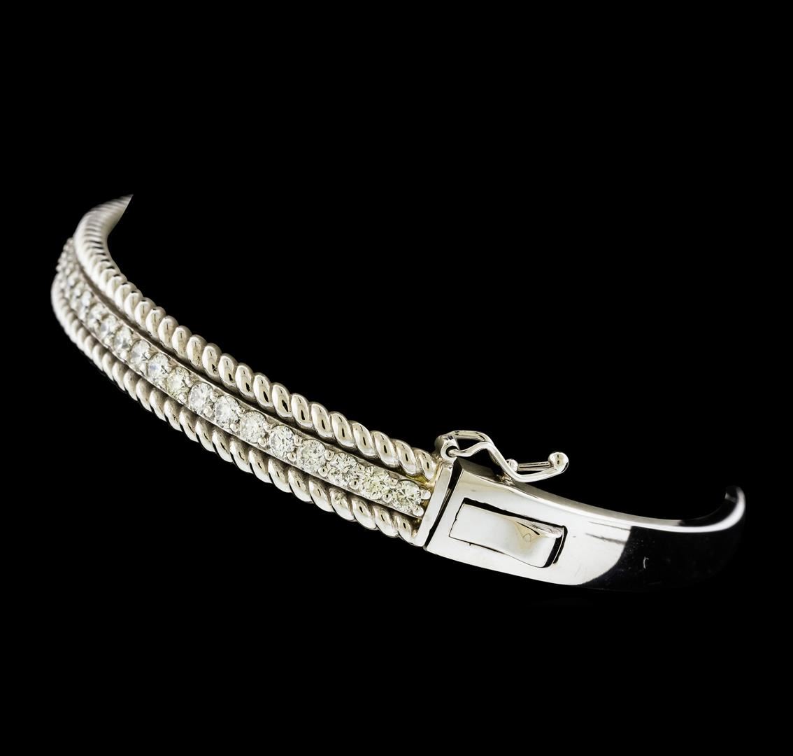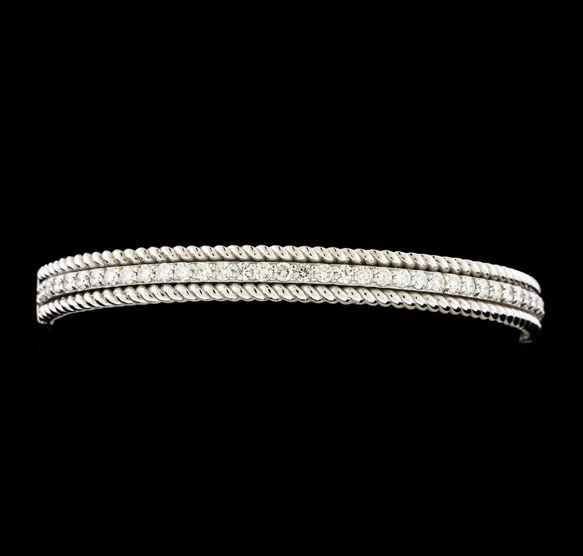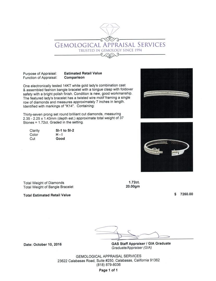 One electronically tested 14KT white gold lady's combination cast & assembled fashion bangle bracelet with a tongue clasp with foldover safety with a bright polish finish. The featured lady's bracelet has a twisted wire motif framing a single row of diamonds and measures approximately 7 inches in length. Identified with markings of 'K14'. Condition is new, good workmanship. Containing: Thirty-Seven prong set round brilliant cut diamonds, measuring 2.35 - 2.25 x 1.43mm (depth est.) approximate total weight of 37 Stones = 1.72ct. Graded in the setting. Clarity SI-1 to SI-2. Color: H - I Cut Good. Total Weight of Diamonds 1.72ct.. Total Weight of Bangle Bracelet 20.00gm. GAS Appraised at $7,260.00.
