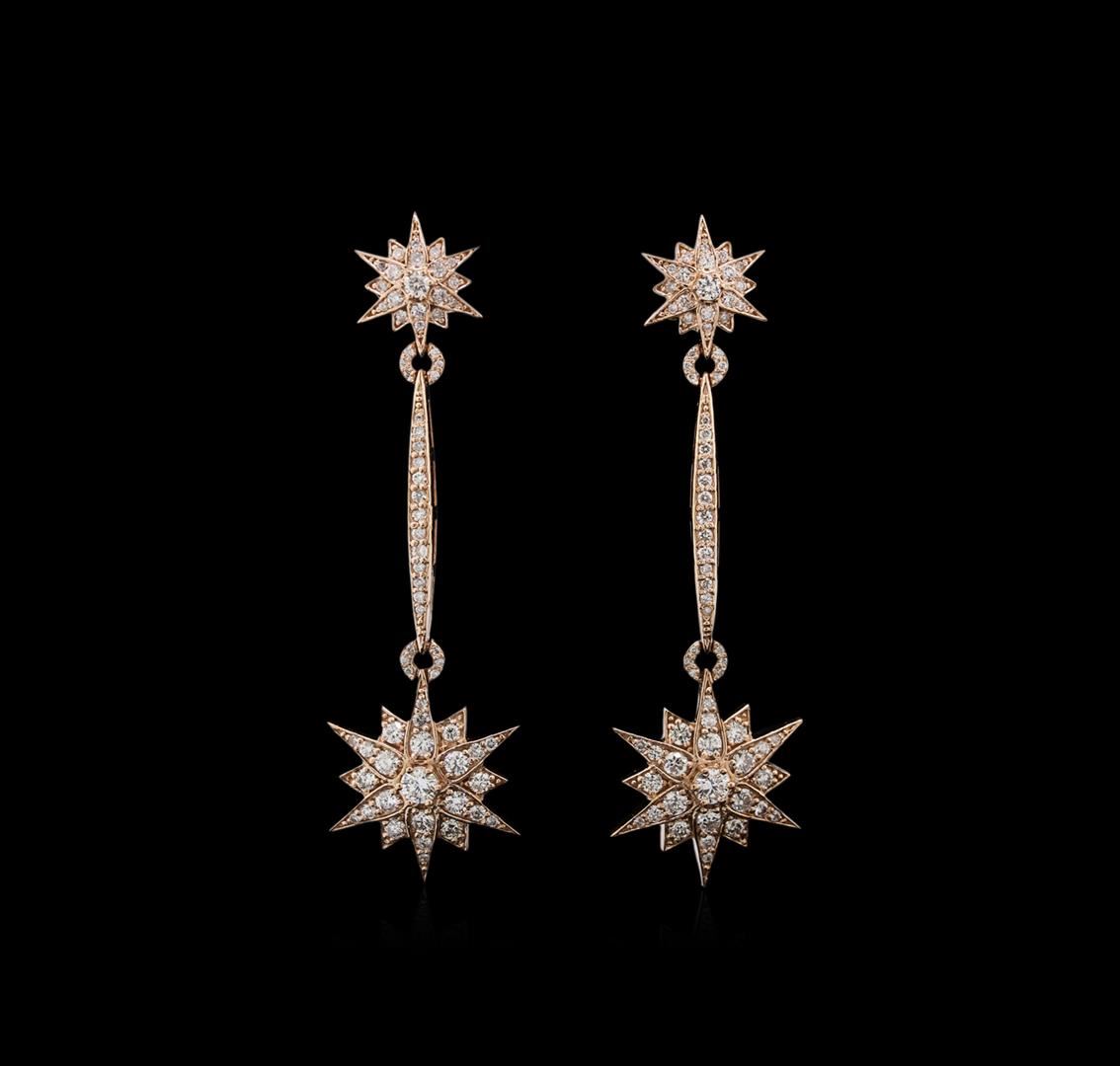 One pair electronically tested 14KT rose gold ladies cast & assembled diamond dangle earrings with 14KT yellow gold standard backs. Each earring features a diamond set star burst supported by a diamond ribbon, completed by a smaller matching diamond set star burst. Bright polish finish. Identified with markings of "585". Condition is new, good workmanship. Containing: Two prong set round brilliant cut diamonds exact total weight 2 Stones = 0.22ct. Graded in the setting. Clarity: SI-1. Color: G One Hundred Forty prong set round brilliant cut diamonds exact total weight 140 Stones = 1.50ct. Graded in the setting. Clarity: SI-1 to I-1. Color: F - H. Total Weight of Diamonds 1.72ct. Total Weight of Earrings 10.36gm. AIG Appraised at $7,375.00.