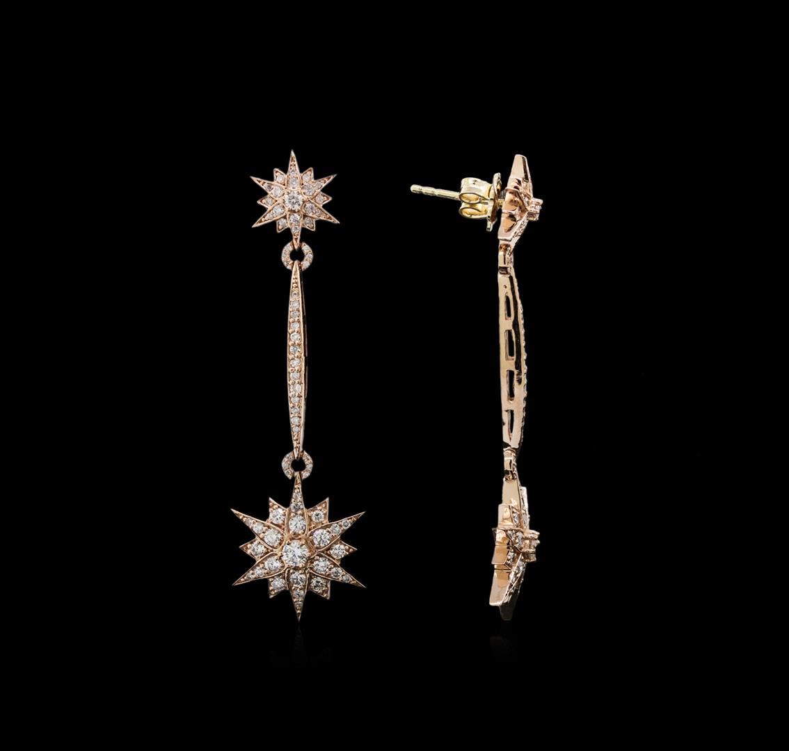 One pair electronically tested 14KT rose gold ladies cast & assembled diamond dangle earrings with 14KT yellow gold standard backs. Each earring features a diamond set star burst supported by a diamond ribbon, completed by a smaller matching diamond set star burst. Bright polish finish. Identified with markings of "585". Condition is new, good workmanship. Containing: Two prong set round brilliant cut diamonds exact total weight 2 Stones = 0.22ct. Graded in the setting. Clarity: SI-1. Color: G One Hundred Forty prong set round brilliant cut diamonds exact total weight 140 Stones = 1.50ct. Graded in the setting. Clarity: SI-1 to I-1. Color: F - H. Total Weight of Diamonds 1.72ct. Total Weight of Earrings 10.36gm. AIG Appraised at $7,375.00.