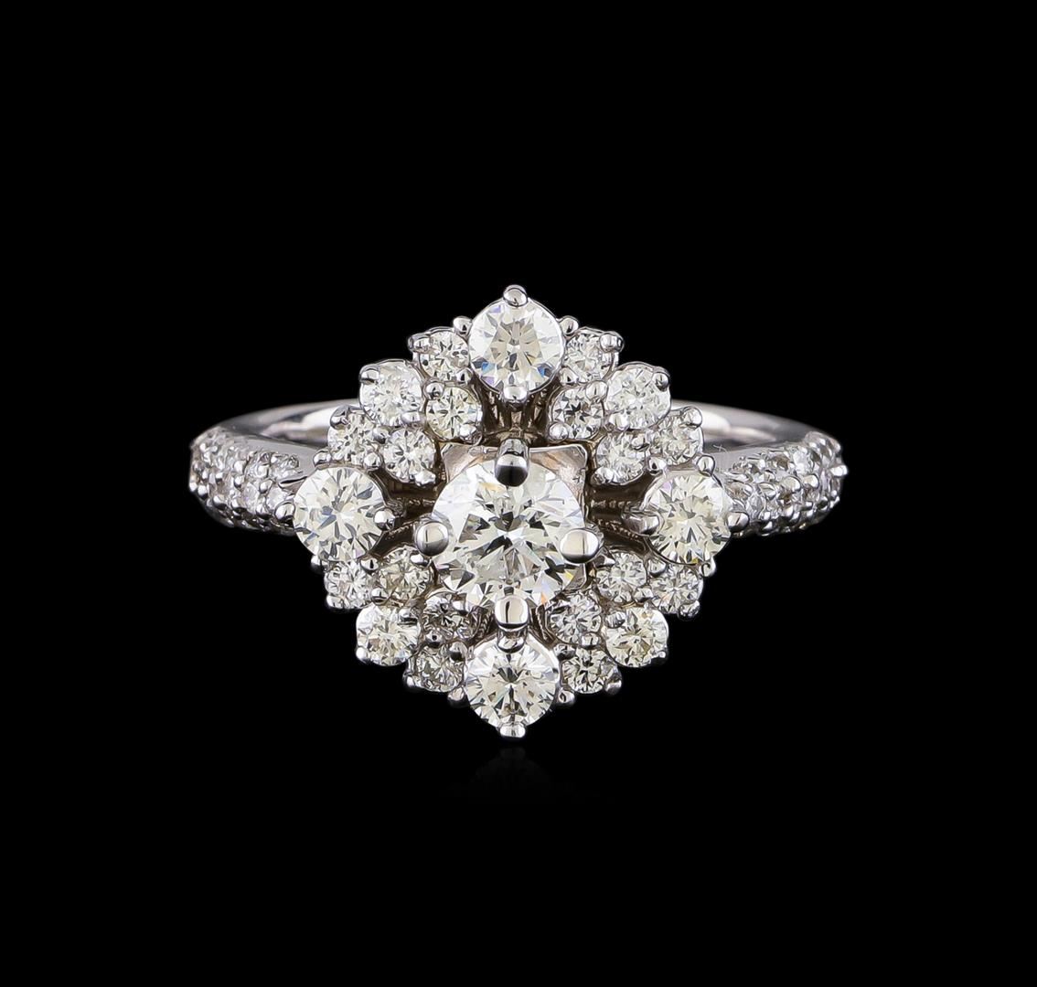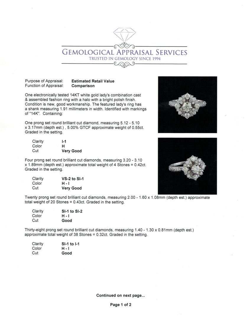 One electronically tested 14KT white gold lady's combination cast & assembled fashion ring with a halo with a bright polish finish. The featured lady's ring has a shank measuring 1.91 millimeters in width. Identified with markings of "14K". Condition is new, good workmanship. Containing: One prong set round brilliant cut diamond, measuring 5.12 - 5.10 x 3.17mm (depth est.) , 5.00.%. GTCF approximate weight of 0.55ct. Graded in the setting. Clarity: I-1. Color: Very Good Four prong set round brilliant cut diamonds, measuring 3.20 - 3.10 x 1.89mm (depth est.) approximate total weight of 4 Stones = 0.42ct. Graded in the setting. Clarity: VS-2 to SI-1. Color: H - I. Cut Very Good Twenty prong set round brilliant cut diamonds, measuring 2.00 - 1.60 x 1.08mm (depth est.) approximate total weight of 20 Stones = 0.43ct. Graded in the setting. Clarity: SI-1 to SI-2. Color: H - I. Cut Good Thirty-Eight prong set round brilliant cut diamonds, measuring 1.40 - 1.30 x 0.81mm (depth est.) approximate total weight of 38 Stones = 0.32ct. Graded in the setting. Clarity: SI-1 to I-1. Color: H - I. Cut Good. Total Weight of Diamonds 1.72ct. Total Weight of Ring 4.80gm. GAS Appraised at $5,930.00.