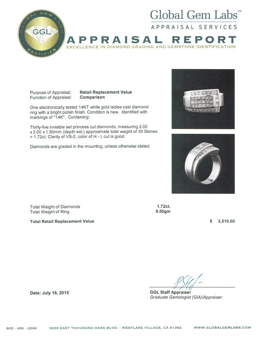 One electronically tested 14KT white gold ladies cast diamond ring with a bright polish finish. Identified with markings of "14K". Condition is new. Containing: Thirty-Five invisible set princess cut diamonds, measuring 2.00 x 2.00 x 1.50mm (depth est.) approximate total weight of 35 Stones = 1.72ct. Clarity: VS-2. Color: H - I, Cut is Good. Diamonds are graded in the mounting, unless otherwise stated. Total Weight of Diamonds 1.72ct. Total Weight of Ring 9.50 grams. GGL Appraised at $3,510.00.