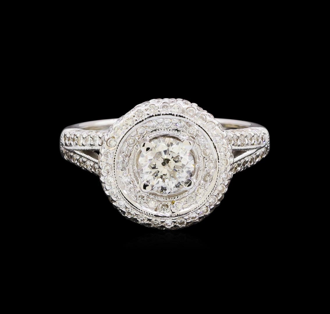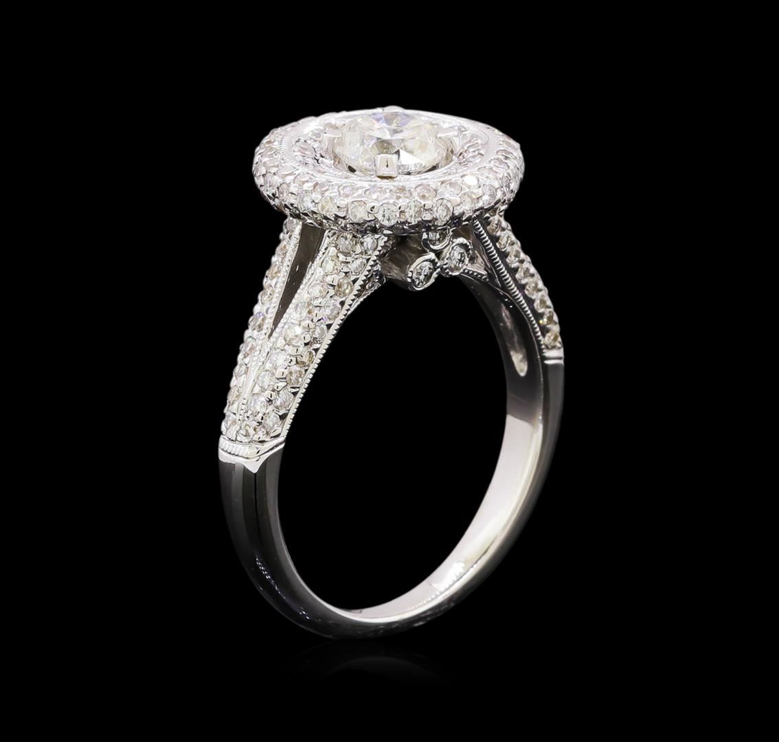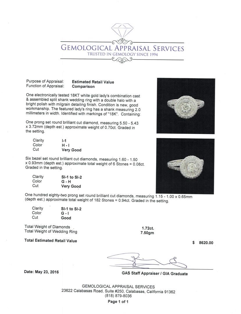 One electronically tested 18KT white gold lady's combination cast & assembled split shank wedding ring with a double halo with a bright polish with milgrain detailing finish. The featured lady's ring has a shank measuring 2.0 millimeters in width. Identified with markings of "18K". Condition is new, good workmanship. Containing: One prong set round brilliant cut diamond, measuring 5.50 - 5.43 x 3.72mm (depth est.) approximate weight of 0.70ct. Graded in the setting. Clarity: I-1. Color: H - I. Cut Very Good Six bezel set round brilliant cut diamonds, measuring 1.60 - 1.50 x 0.93mm (depth est.) approximate total weight of 6 Stones = 0.08ct. Graded in the setting. Clarity: SI-1 to SI-2. Color: G - Very Good One Hundred Eighty-Two prong set round brilliant cut diamonds, measuring 1.15 - 1.00 x 0.65mm (depth est.) approximate total weight of 182 Stones = 0.94ct. Graded in the setting. Clarity: SI-1 to SI-2. Color: G - I. Cut Good. Total Weight of Diamonds 1.72ct. Total Weight of Wedding Ring 7.50gm. GAS Appraised at $8,620.00.