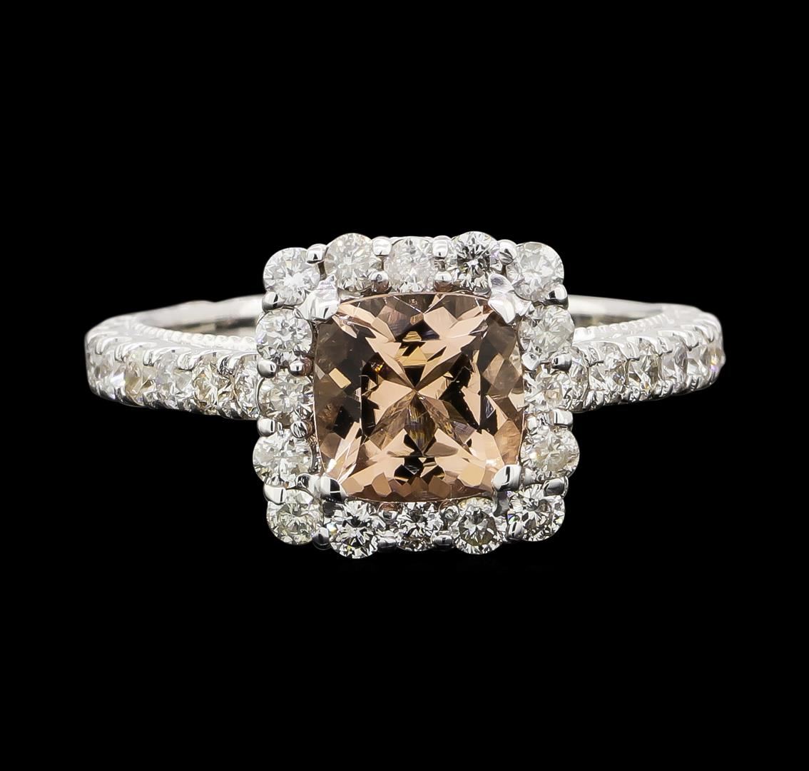 One electronically tested 14KT white gold lady's cast fashion ring with a cathedral shank with a basket halo with a bright polish with milgrain detailing finish. The featured lady's ring has a shank measuring 2.24 millimeters wide. Identified with markings of '14K'. Condition is new, good workmanship. Containing: One prong set square cushion modified brilliant cut natural morganite, measuring 7.08 x 7.05 x 5.30mm, (depth est.) approximate weight of 1.72ct., clarity is eye clean, light, moderately strong, reddish orange color, (GIA rO 3/4), cut is good. Transmitting light with no distortion, transparent. Colored gemstones are presumed to have been subjected to commonly used enhancement processes. Graded in the setting. Thirty-Two prong set round brilliant cut diamonds, measuring 2.00 - 1.90 x 1.21mm (depth est.) approximate total weight of 32 Stones = 0.90ct. Graded in the setting. Clarity SI-1 to I-1. Color: G - I Cut Good Eighteen prong set round brilliant cut diamonds, measuring 1.30 - 1.20 x 0.78mm (depth est.) approximate total weight of 18 Stones = 0.15ct. Graded in the setting. Clarity SI-1 to SI-2. Color: H - I Cut Good. Total Weight of Colored Stones 1.72ct.. Total Weight of Diamonds 1.05ct.. Total Weight of Ring 4.80gm. GAS Appraised at $3,780.00.