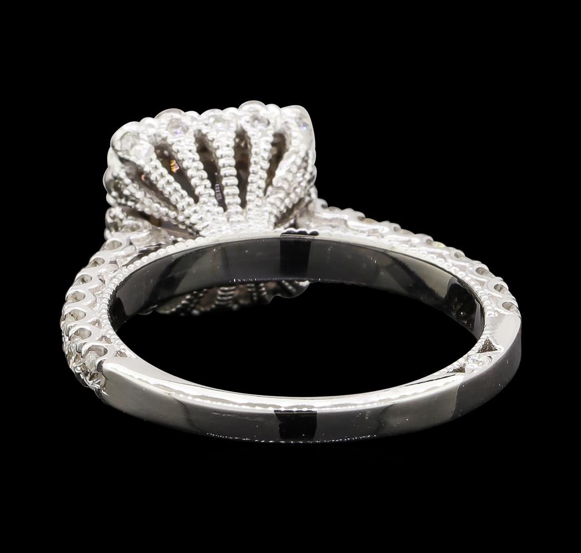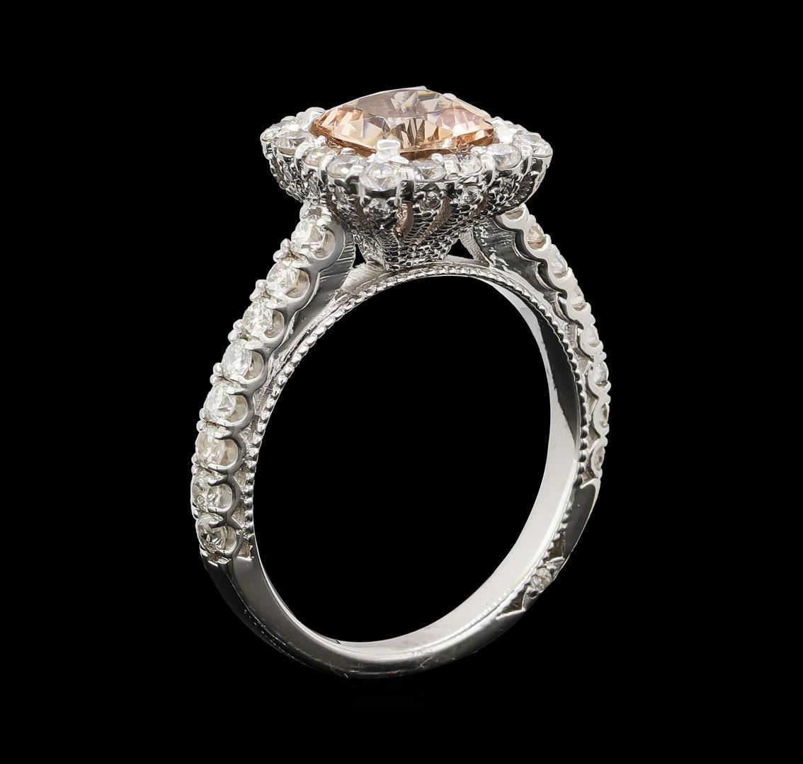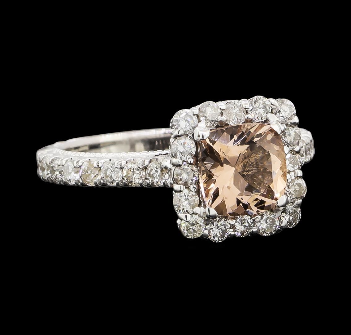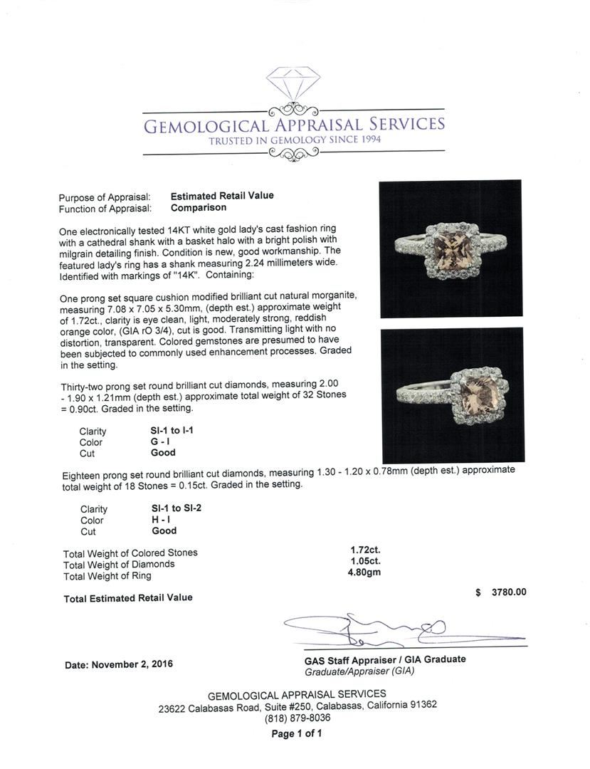 One electronically tested 14KT white gold lady's cast fashion ring with a cathedral shank with a basket halo with a bright polish with milgrain detailing finish. The featured lady's ring has a shank measuring 2.24 millimeters wide. Identified with markings of '14K'. Condition is new, good workmanship. Containing: One prong set square cushion modified brilliant cut natural morganite, measuring 7.08 x 7.05 x 5.30mm, (depth est.) approximate weight of 1.72ct., clarity is eye clean, light, moderately strong, reddish orange color, (GIA rO 3/4), cut is good. Transmitting light with no distortion, transparent. Colored gemstones are presumed to have been subjected to commonly used enhancement processes. Graded in the setting. Thirty-Two prong set round brilliant cut diamonds, measuring 2.00 - 1.90 x 1.21mm (depth est.) approximate total weight of 32 Stones = 0.90ct. Graded in the setting. Clarity SI-1 to I-1. Color: G - I Cut Good Eighteen prong set round brilliant cut diamonds, measuring 1.30 - 1.20 x 0.78mm (depth est.) approximate total weight of 18 Stones = 0.15ct. Graded in the setting. Clarity SI-1 to SI-2. Color: H - I Cut Good. Total Weight of Colored Stones 1.72ct.. Total Weight of Diamonds 1.05ct.. Total Weight of Ring 4.80gm. GAS Appraised at $3,780.00.