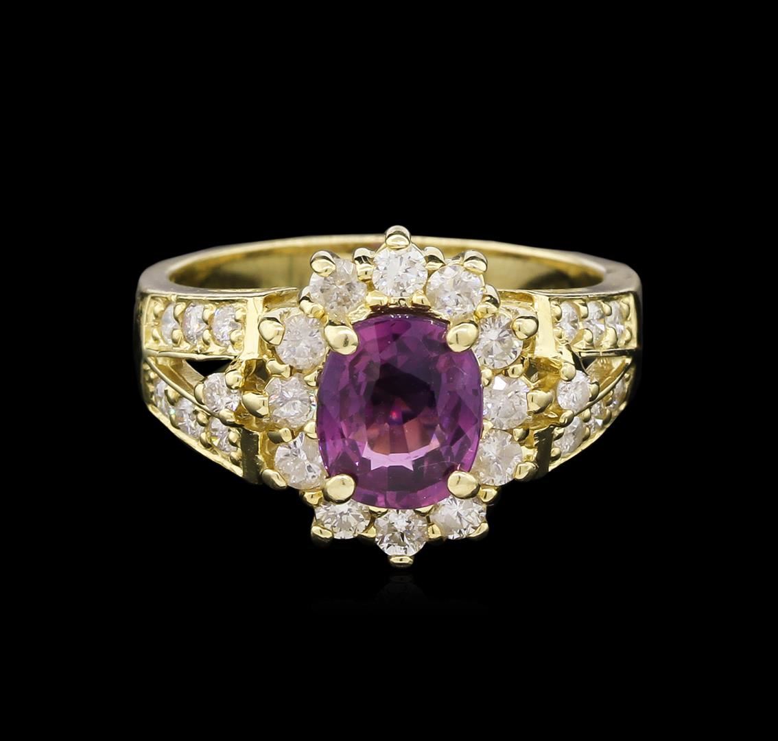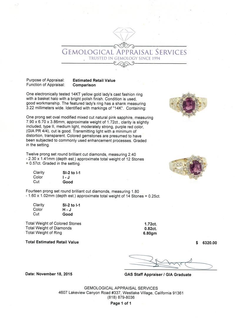 One electronically tested 14KT yellow gold lady's cast fashion ring with a basket halo with a bright polish finish. The featured lady's ring has a shank measuring 3.22 millimeters wide. Identified with markings of "14K". Condition is used, good workmanship. Containing: One prong set oval modified mixed cut natural pink sapphire, measuring 7.90 x 6.70 x 3.86mm, approximate weight of 1.72ct., clarity is slightly included, type II, medium light, moderately strong, purple red color, (GIA PR 4/4), cut is good. Transmitting light with a minimum of distortion, transparent. Colored gemstones are presumed to have been subjected to commonly used enhancement processes. Graded in the setting. Twelve prong set round brilliant cut diamonds, measuring 2.40 - 2.30 x 1.41mm (depth est.) approximate. Total Weight of 12 Stones = 0.57ct. Graded in the setting. Clarity: SI-2 to I-1. Color: I - J. Cut Good Fourteen prong set round brilliant cut diamonds, measuring 1.80 - 1.60 x 1.02mm (depth est.) approximate. Total Weight of 14 Stones = 0.25ct. Clarity: SI-2 to I-1. Color: H - Good. Total Weight of Colored Stones 1.72ct. Total Weight of Diamonds 0.82ct. Total Weight of Ring 6.80gm. GAS Appraised.