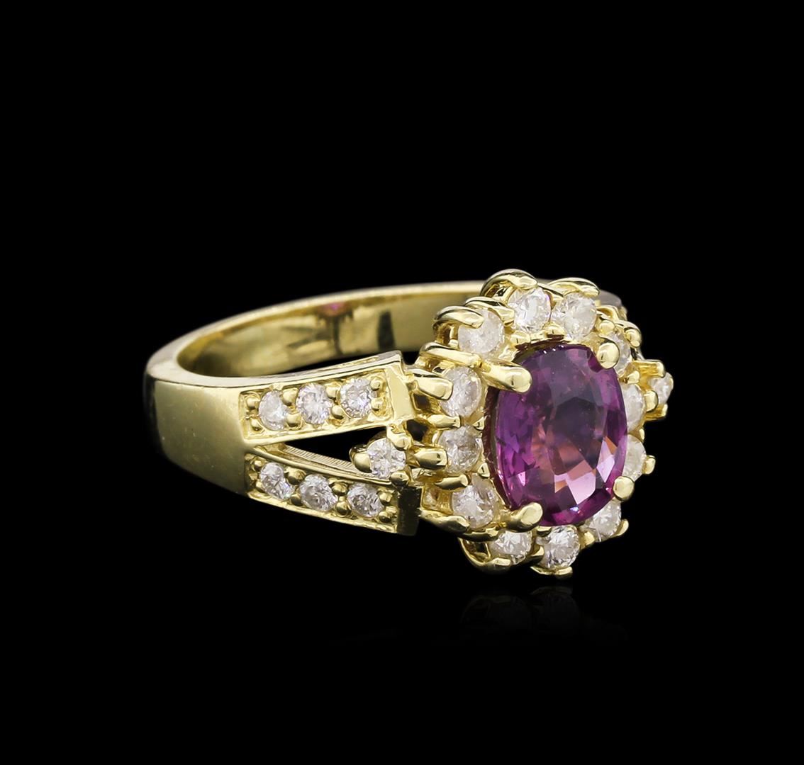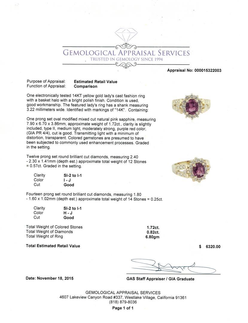 One electronically tested 14KT yellow gold lady's cast fashion ring with a basket halo with a bright polish finish. The featured lady's ring has a shank measuring 3.22 millimeters wide. Identified with markings of "14K". Condition is used, good workmanship. Containing: One prong set oval modified mixed cut natural pink sapphire, measuring 7.90 x 6.70 x 3.86mm, approximate weight of 1.72ct., clarity is slightly included, type II, medium light, moderately strong, purple red color, (GIA PR 4/4), cut is good. Transmitting light with a minimum of distortion, transparent. Colored gemstones are presumed to have been subjected to commonly used enhancement processes. Graded in the setting. Twelve prong set round brilliant cut diamonds, measuring 2.40 - 2.30 x 1.41mm (depth est.) approximate. Total Weight of 12 Stones = 0.57ct. Graded in the setting. Clarity: SI-2 to I-1. Color: I - J. Cut Good Fourteen prong set round brilliant cut diamonds, measuring 1.80 - 1.60 x 1.02mm (depth est.) approximate. Total Weight of 14 Stones = 0.25ct. Clarity: SI-2 to I-1. Color: H - Good. Total Weight of Colored Stones 1.72ct. Total Weight of Diamonds 0.82ct. Total Weight of Ring 6.80gm. GAS Appraised.