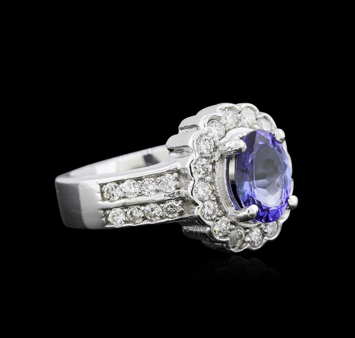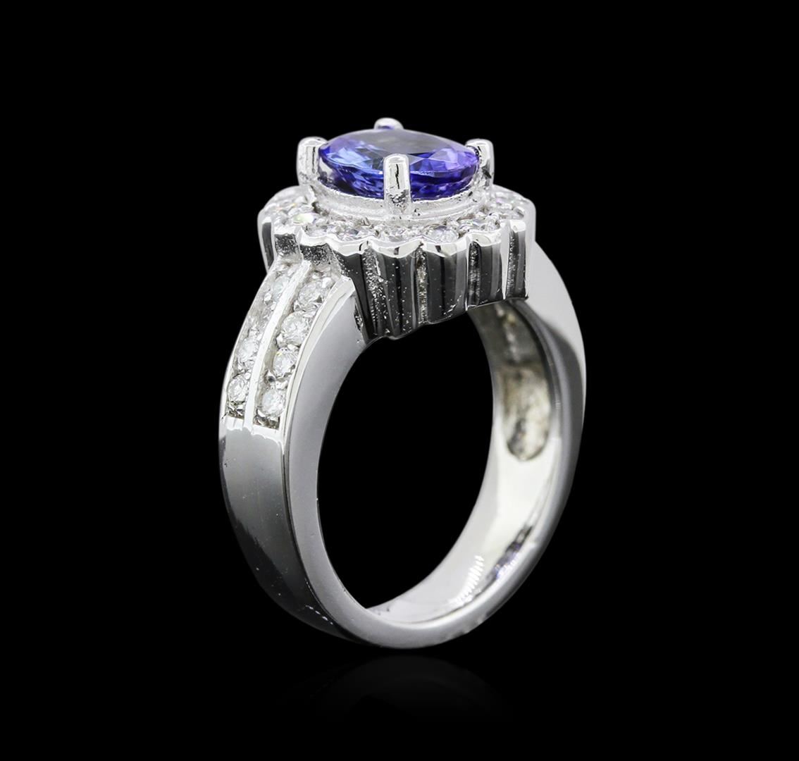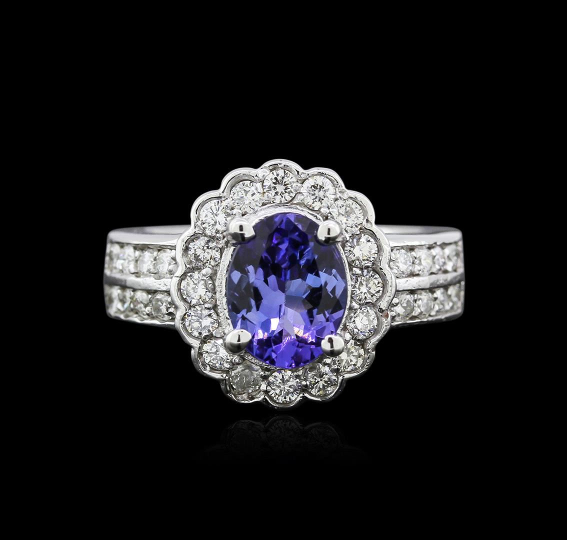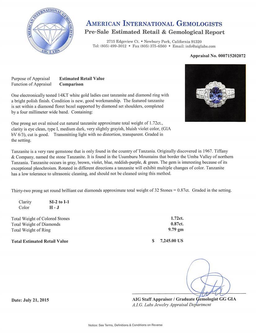 One electronically tested 14KT white gold ladies cast tanzanite and diamond ring with a bright polish finish. The featured tanzanite is set within a diamond floret bezel supported by diamond set shoulders, completed by a four millimeter wide band. Condition is new, good workmanship. Containing: One prong set oval mixed cut natural tanzanite approximate total weight of 1.72ct., clarity is eye clean, type I, medium dark, very slightly grayish, bluish violet color, (GIA bV 6/3), cut is good. Transmitting light with no distortion, transparent. Graded in the setting. Tanzanite is a very rare gemstone that is only found in the country of Tanzania. Originally discovered in 1967. Tiffany & Company, named the stone Tanzanite. It is found in the Usumburu Mountains that border the Umba Valley of northern Tanzania. Tanzanite occurs in gray, brown, violet, blue, reddish-purple, & green. The gem is interesting because of its exceptional pleochroism. Rotated in different directions a tanzanite will exhibit multiple changes of color. Tanzanite has a low tolerance to ultrasonic cleaning, and should not be cleaned using this method. Thirty-Two prong set round brilliant cut diamonds approximate total weight of 32 Stones = 0.87ct. Graded in the setting. Clarity SI-2 to I-1 Color H - J. Total Weight of Colored Stones 1.72ct. Total Weight of Diamonds 0.87ct. Total Weight of Ring 9.79 grams. AIG Appraised at $7,245.00.
