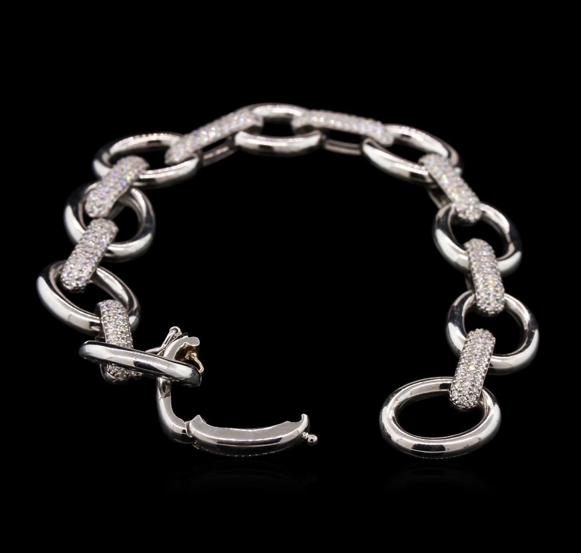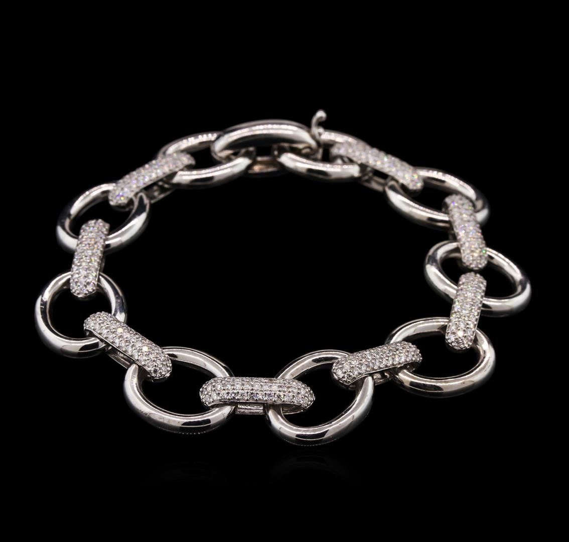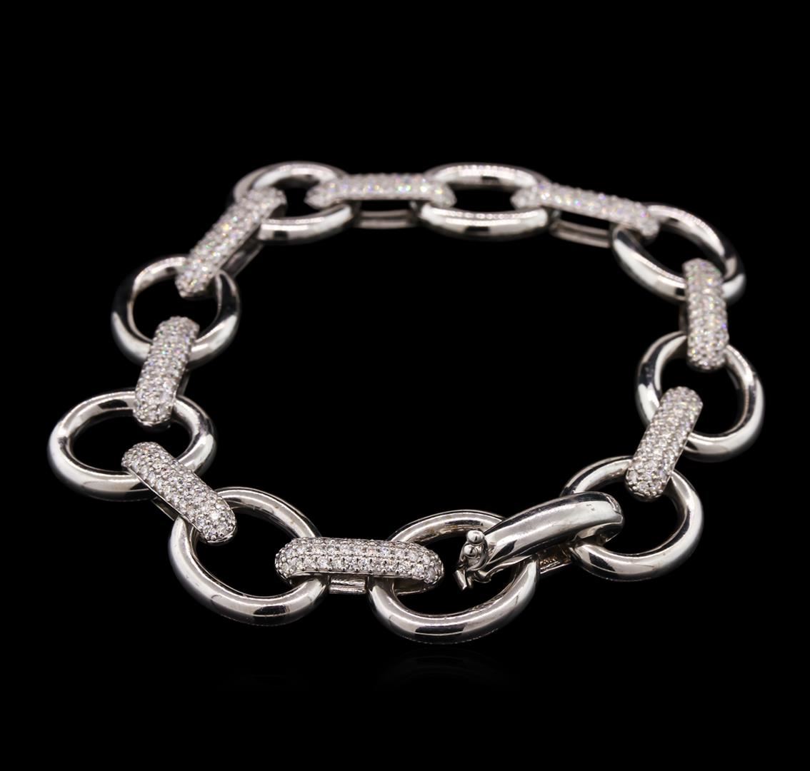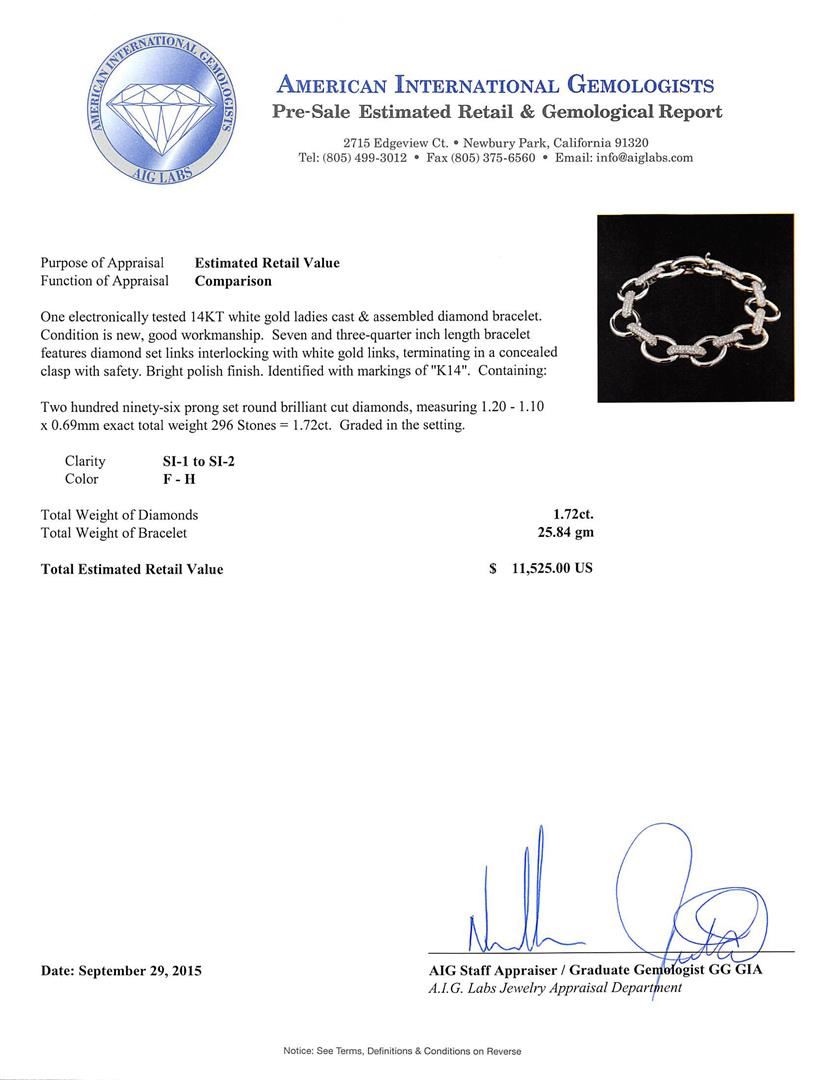 One electronically tested 14KT white gold ladies cast & assembled diamond bracelet. Seven and three-quarter inch length bracelet features diamond set links interlocking with white gold links, terminating in a concealed clasp with safety. Bright polish finish. Identified with markings of "K14". Condition is new, good workmanship. Containing: Two Hundred Ninety-Six prong set round brilliant cut diamonds, measuring 1.20 - 1.10 x 0.69mm exact total weight 296 Stones = 1.72ct. Graded in the setting. Clarity: SI-1 to SI-2. Color: F - H. Total Weight of Diamonds 1.72ct. Total Weight of Bracelet 25.84gm. AIG Appraised at $11,525.00.