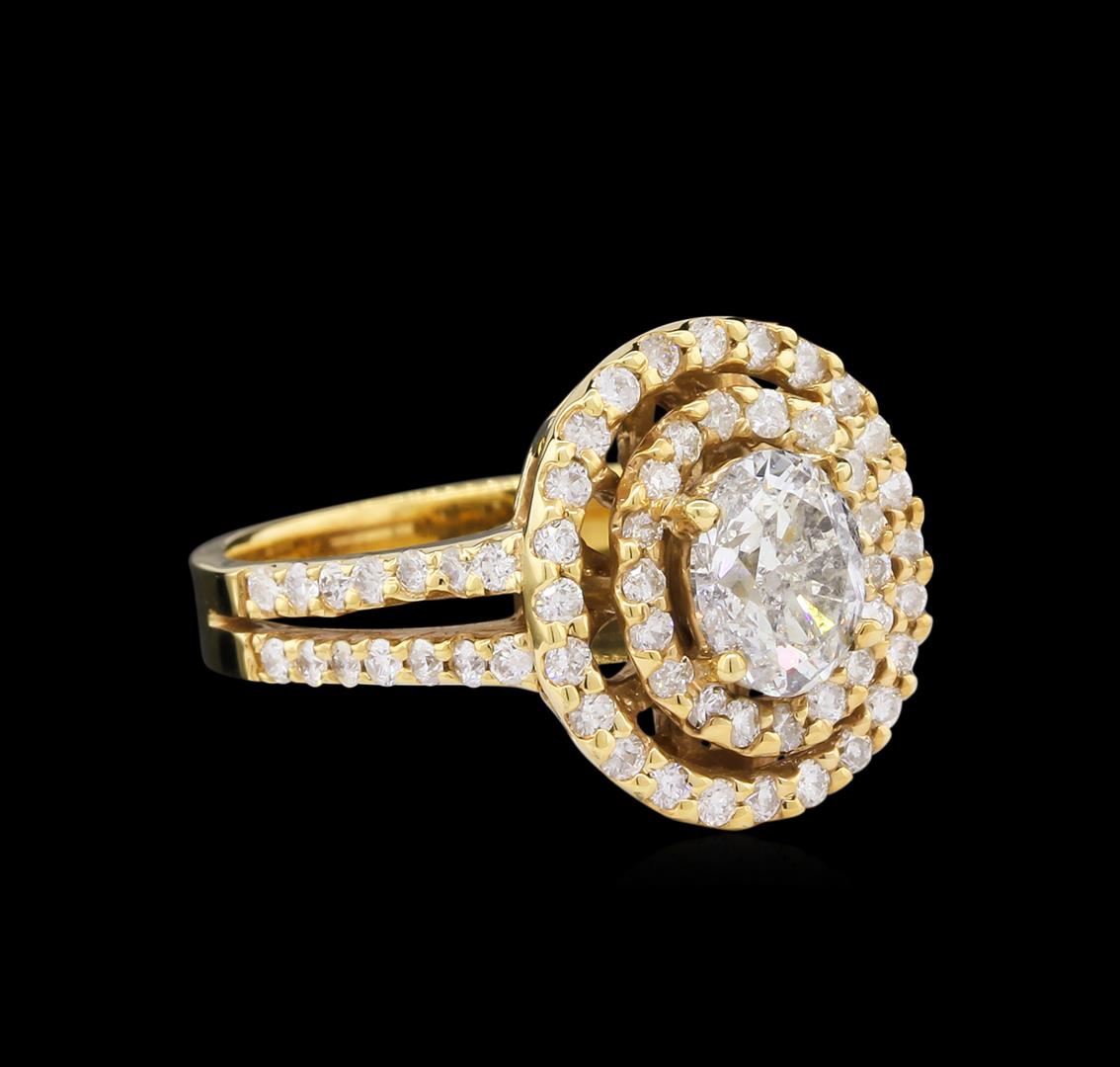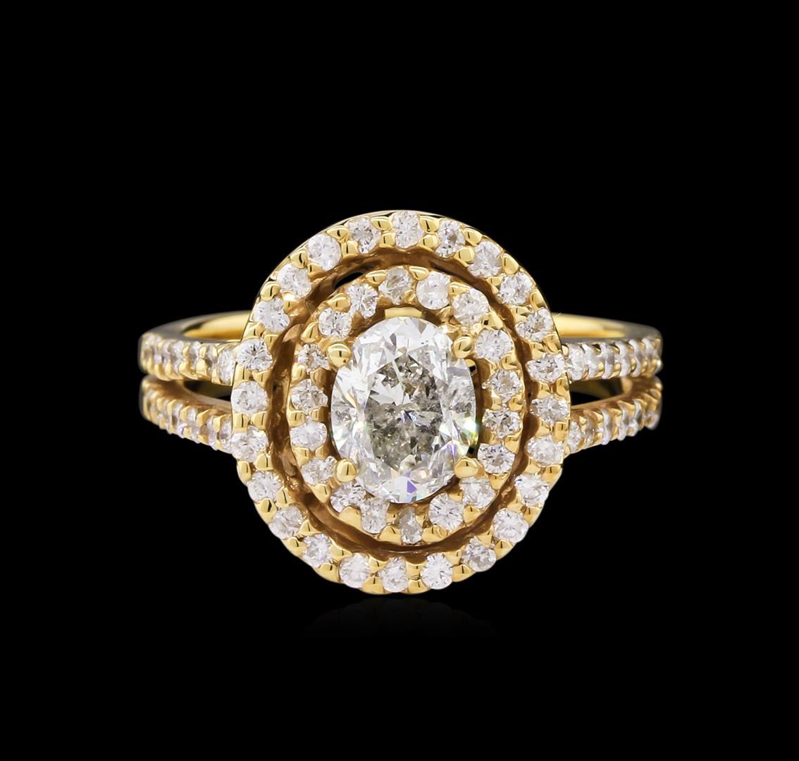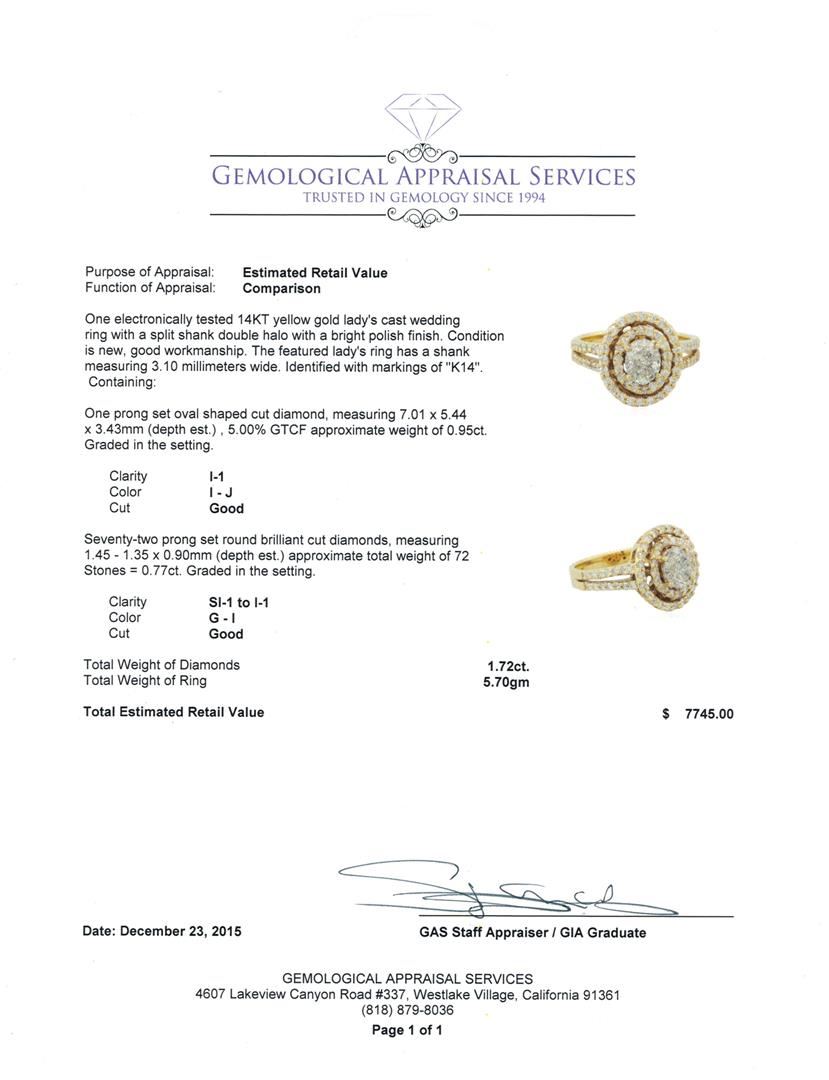 One electronically tested 14KT yellow gold lady's cast wedding ring with a split shank double halo with a bright polish finish. The featured lady's ring has a shank measuring 3.10 millimeters wide. Identified with markings of "K14". Condition is new, good workmanship. Containing: One prong set oval shaped cut diamond, measuring 7.01 x 5.44 x 3.43mm (depth est.) , 5.00% GTCF approximate weight of 0.95ct. Graded in the setting. Clarity: I-1. Color: I - Good Seventy-Two prong set round brilliant cut diamonds, measuring 1.45 - 1.35 x 0.90mm (depth est.) approximate total weight of 72 Stones = 0.77ct. Graded in the setting. Clarity: SI-1 to I-1. Color: G - I. Cut Good. Total Weight of Diamonds 1.72ct. Total Weight of Ring 5.70gm. GAS Appraised at $7,745.00.