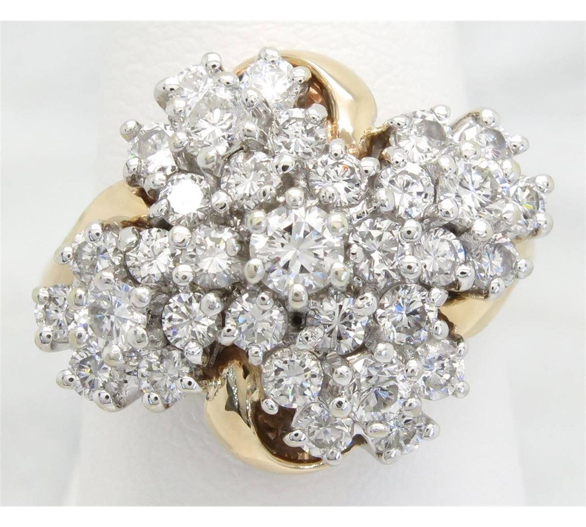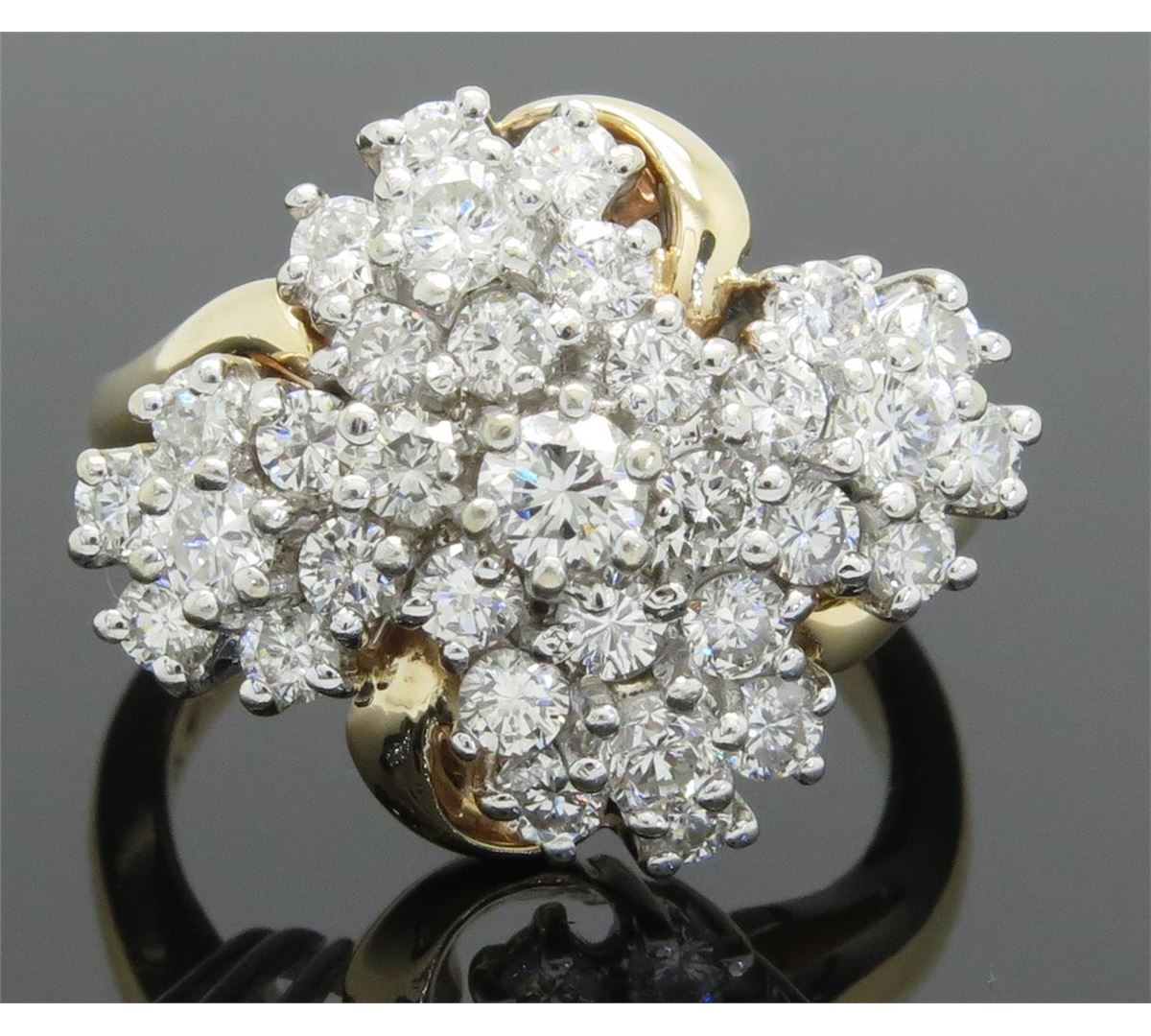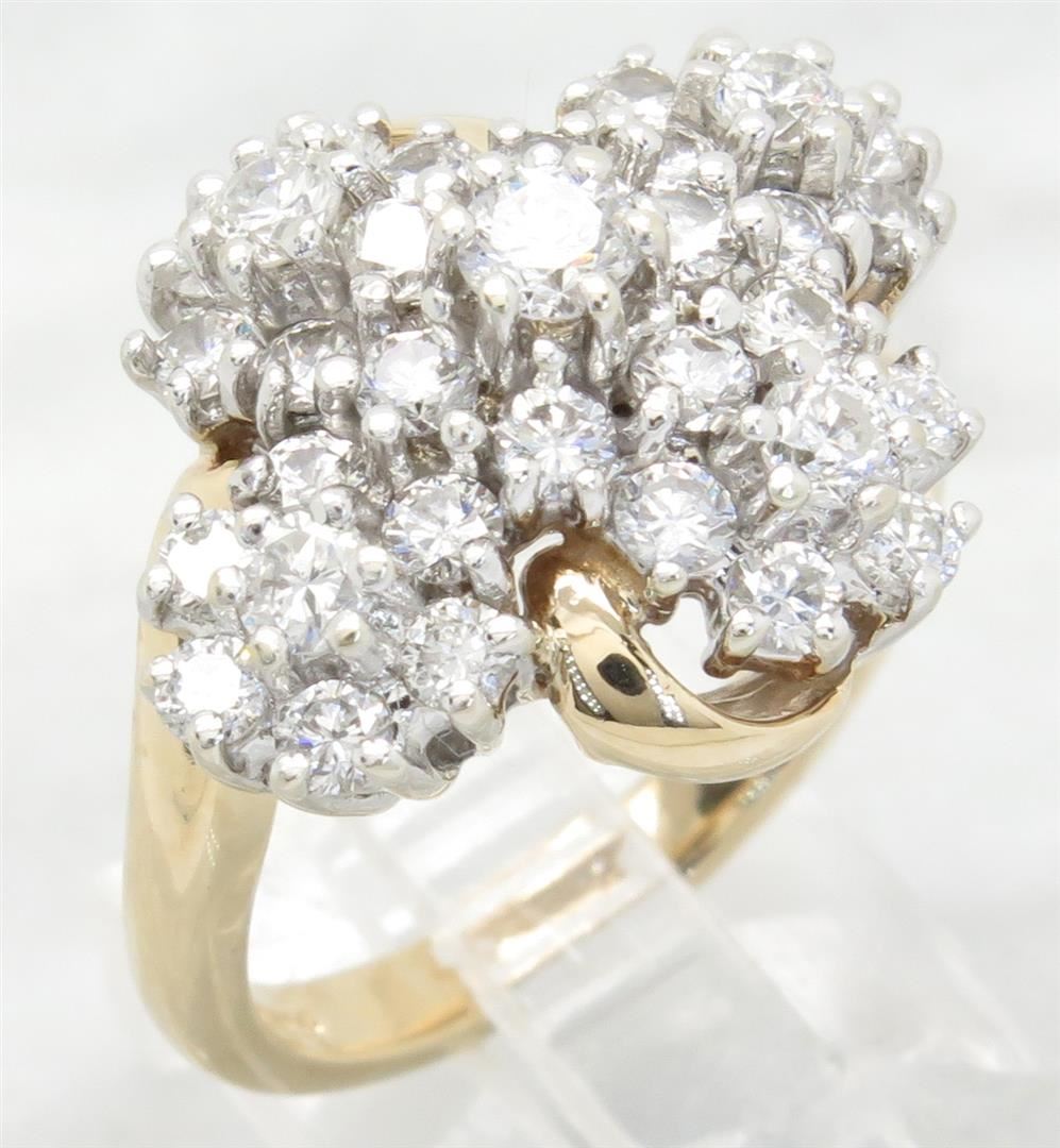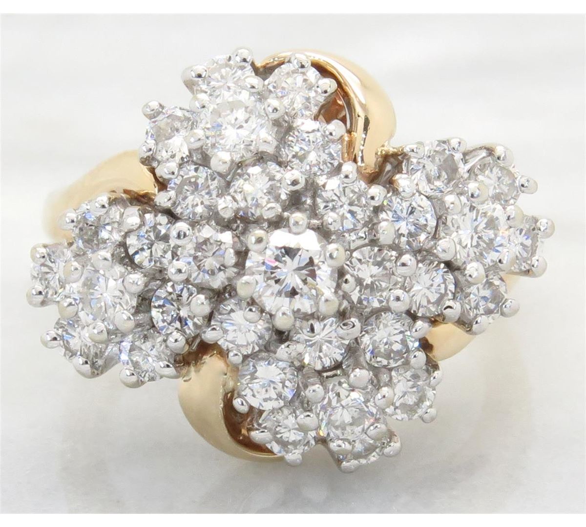 One tested 14K yellow gold diamond ring. Containing: 31 Round Brilliant Cut Diamonds. Clarity: I-SI, Color: G-H. Approximate total diamond weight: 1.72CTW. All diamonds are graded in the mounting unless otherwise stated. Weight of ring: 8.7 grams, Size: 6.0.
