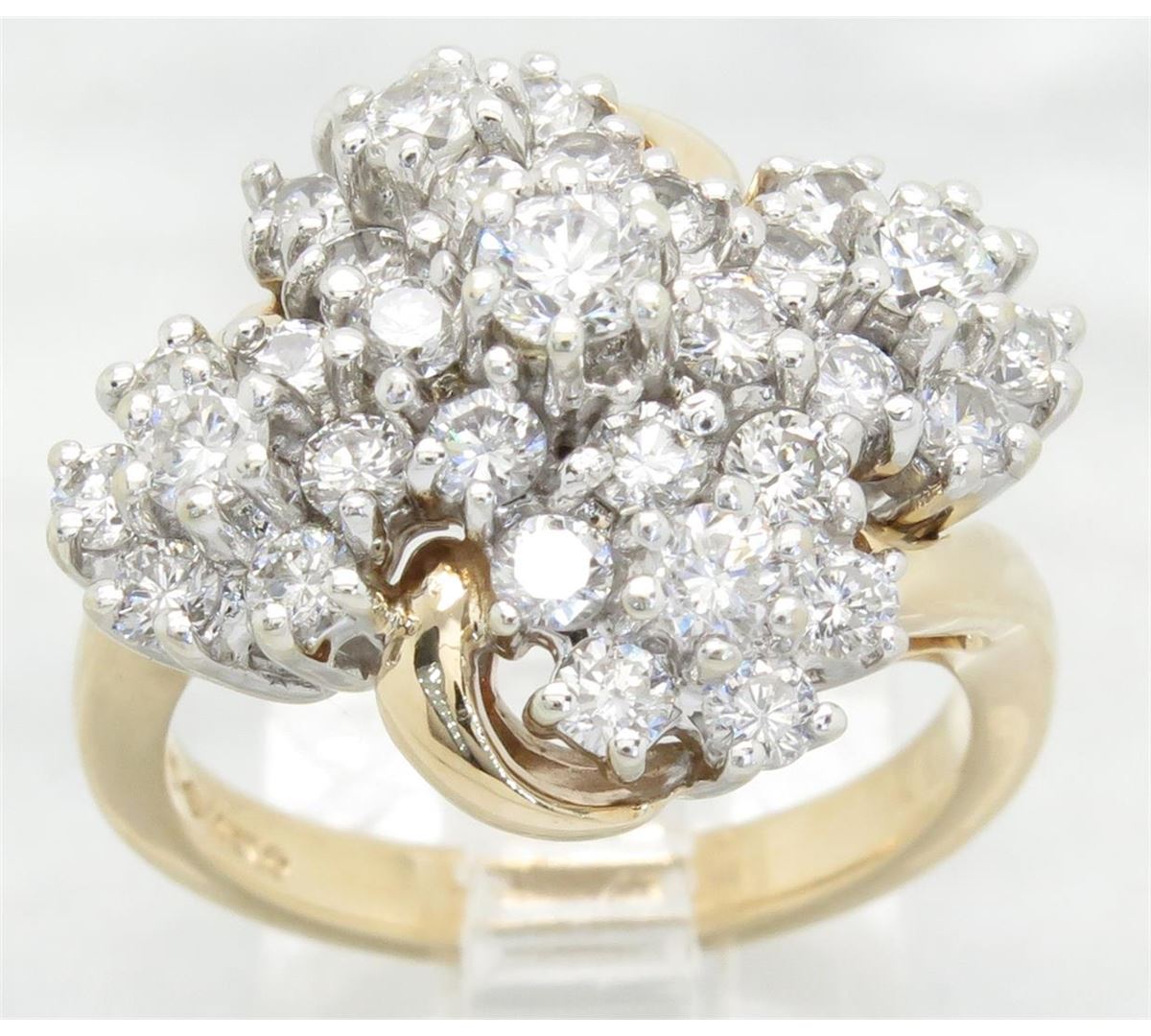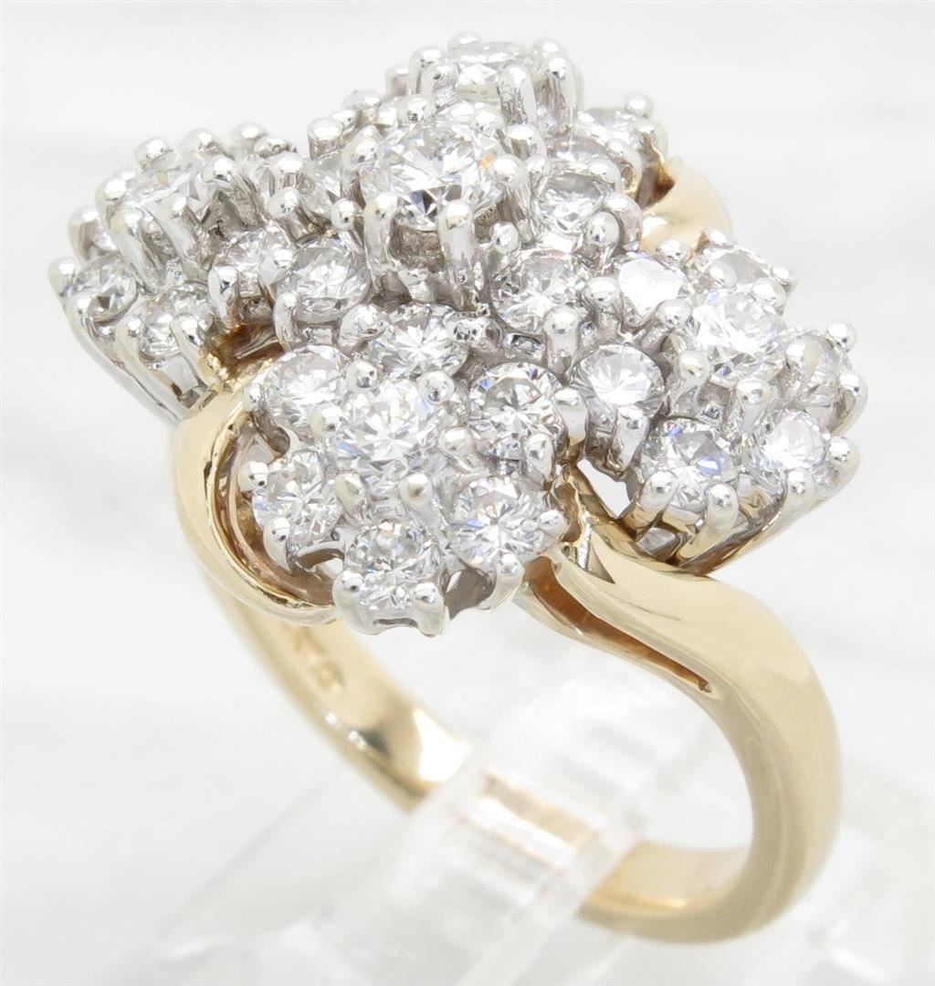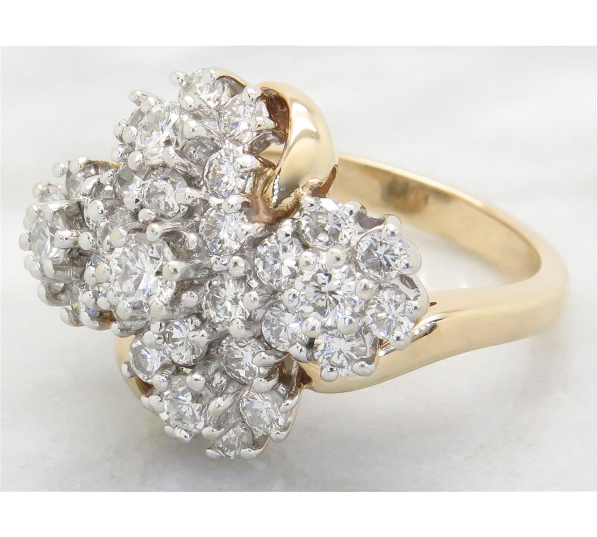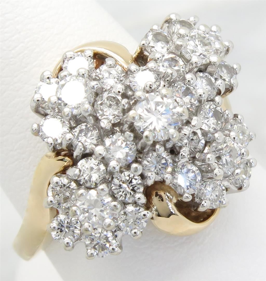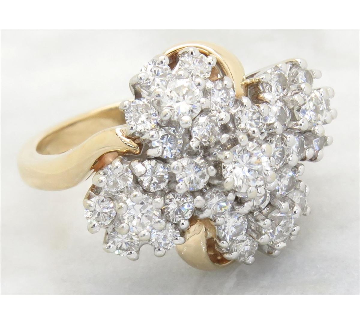 One tested 14K yellow gold diamond ring. Containing: 31 Round Brilliant Cut Diamonds. Clarity: I-SI, Color: G-H. Approximate total diamond weight: 1.72CTW. All diamonds are graded in the mounting unless otherwise stated. Weight of ring: 8.7 grams, Size: 6.0.