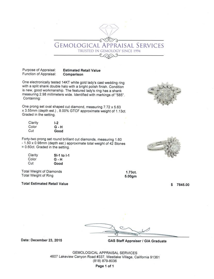 One electronically tested 14KT white gold lady's cast wedding ring with a split shank double halo with a bright polish finish. The featured lady's ring has a shank measuring 2.98 millimeters wide. Identified with markings of "585". Condition is new, good workmanship. Containing: One prong set oval shaped cut diamond, measuring 7.72 x 5.63 x 3.55mm (depth est.) , 8.00% GTCF approximate weight of 1.13ct. Graded in the setting. Clarity: I-2. Color: G - Good Forty-Two prong set round brilliant cut diamonds, measuring 1.60 - 1.50 x 0.98mm (depth est.) approximate total weight of 42 Stones = 0.60ct. Graded in the setting. Clarity: SI-1 to I-1. Color: G - Good. Total Weight of Diamonds 1.73ct. Total Weight of Ring 5.00gm. GAS Appraised at $7,845.00.