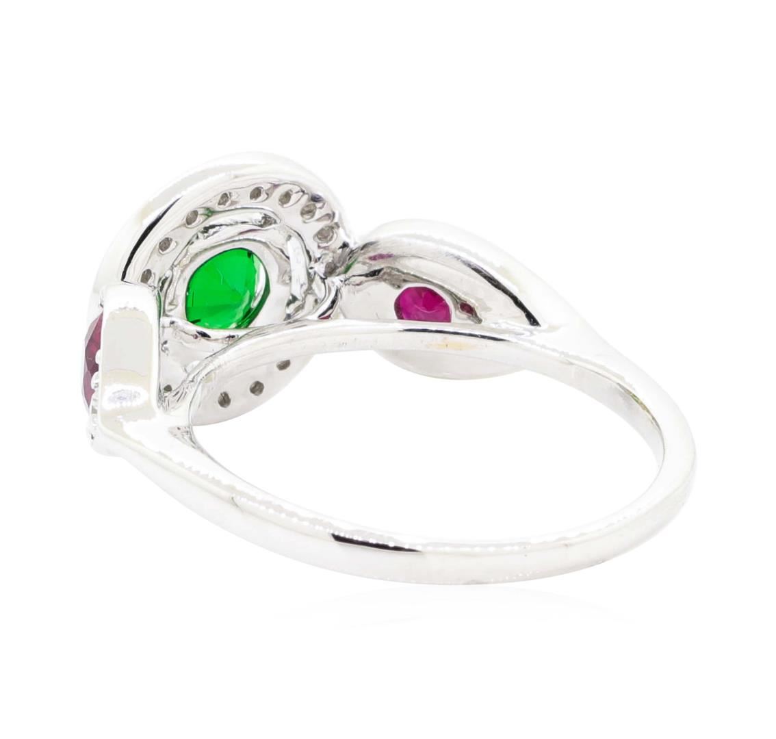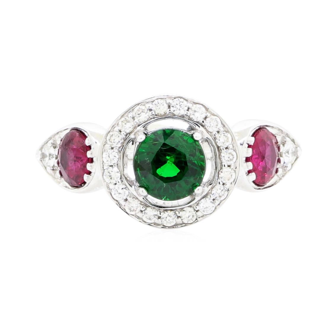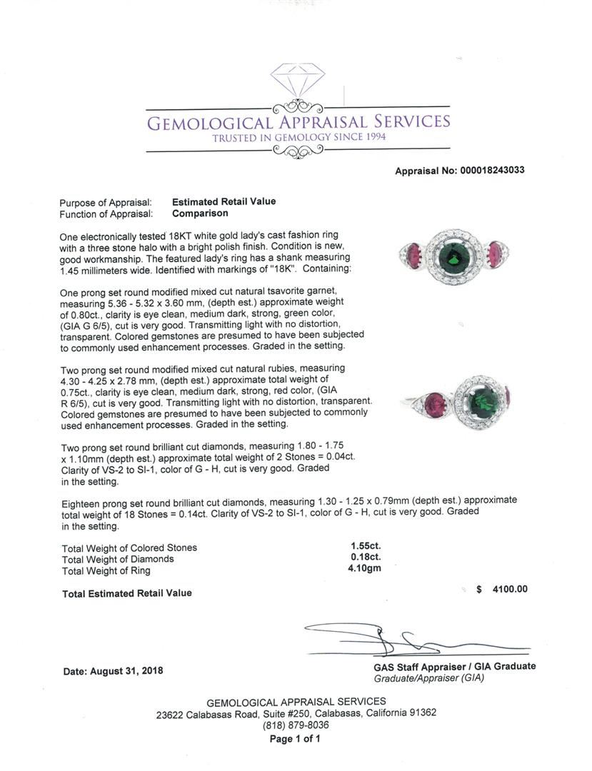 One electronically tested 18KT white gold lady's cast fashion ring with a three stone halo with a bright polish finish. The featured lady's ring has a shank measuring 1.45 millimeters wide. Identified with markings of '18K'. Condition is new, good workmanship. Containing: One prong set round modified mixed cut natural tsavorite garnet, measuring 5.36 - 5.32 x 3.60 mm, (depth est.) approximate weight of 0.80ct., clarity is eye clean, medium dark, strong, green color, (GIA G 6/5), cut is very good. Transmitting light with no distortion, transparent. Colored gemstones are presumed to have been subjected to commonly used enhancement processes. Graded in the setting. Two prong set round modified mixed cut natural rubies, measuring 4.30 - 4.25 x 2.78 mm, (depth est.) approximate total weight of 0.75ct., clarity is eye clean, medium dark, strong, red color, (GIA R 6/5), cut is very good. Transmitting light with no distortion, transparent. Colored gemstones are presumed to have been subjected to commonly used enhancement processes. Graded in the setting. Two prong set round brilliant cut diamonds, measuring 1.80 - 1.75 x 1.10mm (depth est.) approximate total weight of 2 Stones = 0.04ct. Graded in the setting. Color G - H Clarity VS-2 to SI-1 Cut Very Good Eighteen prong set round brilliant cut diamonds, measuring 1.30 - 1.25 x 0.79mm (depth est.) approximate total weight of 18 Stones = 0.14ct. Graded in the setting. Color G - H Clarity VS-2 to SI-1 Cut Very Good. Total Weight of Colored Stones 1.55ct.. Total Weight of Diamonds 0.18ct.. Total Weight of Ring 4.10gm GAS Appraised at $4100.00. GAS Appraised.