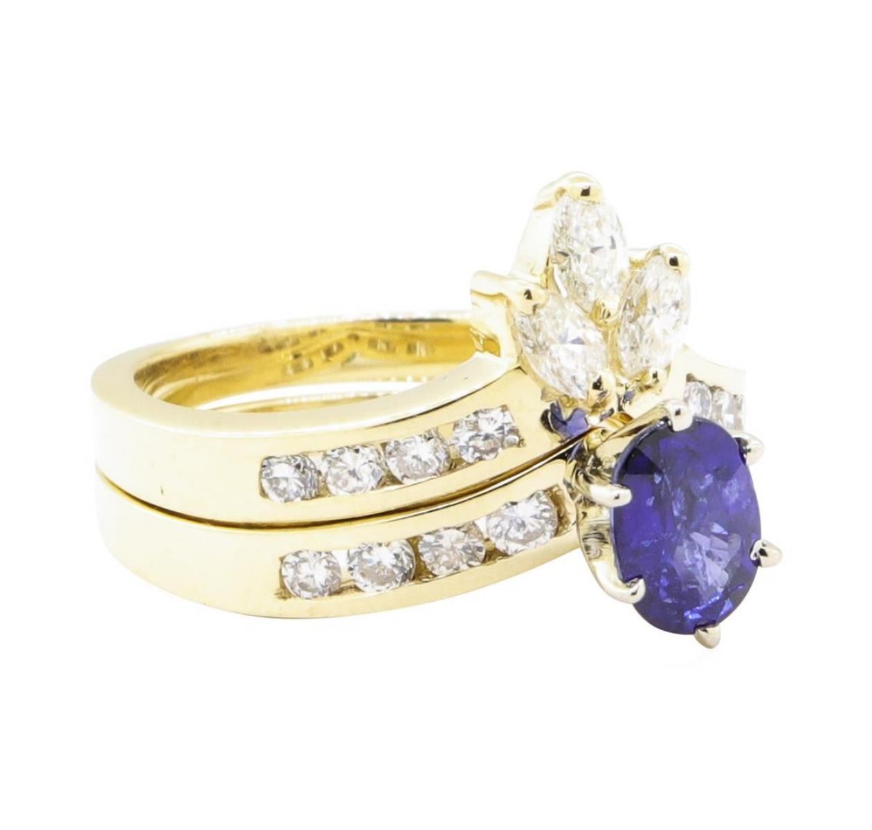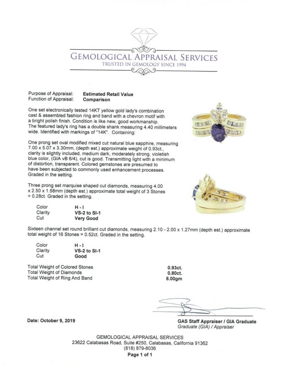 One set electronically tested 14KT yellow gold lady's combination cast & assembled fashion ring and band with a chevron motif with a bright polish finish. The featured lady's ring has a double shank measuring 4.40 millimeters wide. Identified with markings of '14K'. Condition is Good. Containing: One prong set oval modified mixed cut natural blue sapphire, measuring 7.00 x 5.07 x 3.30mm, (depth est.) approximate weight of 0.93ct., clarity is slightly included, medium dark, moderately strong, violetish blue color, (GIA vB 6/4), cut is good. Transmitting light with a minimum of distortion, transparent. Colored gemstones are presumed to have been subjected to commonly used enhancement processes. Graded in the setting. Three prong set marquise shaped cut diamonds, measuring 4.00 x 2.50 x 1.58mm (depth est.) approximate total weight of 3 Stones = 0.28ct. Graded in the setting. Color H - I Clarity VS-2 to SI-1 Cut Very Good Sixteen channel set round brilliant cut diamonds, measuring 2.10 - 2.00 x 1.27mm (depth est.) approximate total weight of 16 Stones = 0.52ct. Graded in the setting. Color H - I Clarity VS-2 to SI-1 Cut Good. Total Weight of Colored Stones 0.93ct.. Total Weight of Diamonds 0.80 ct.. Total Weight of Ring And Band 8.00gm GAS Appraised at $4100.00. GAS Appraised.