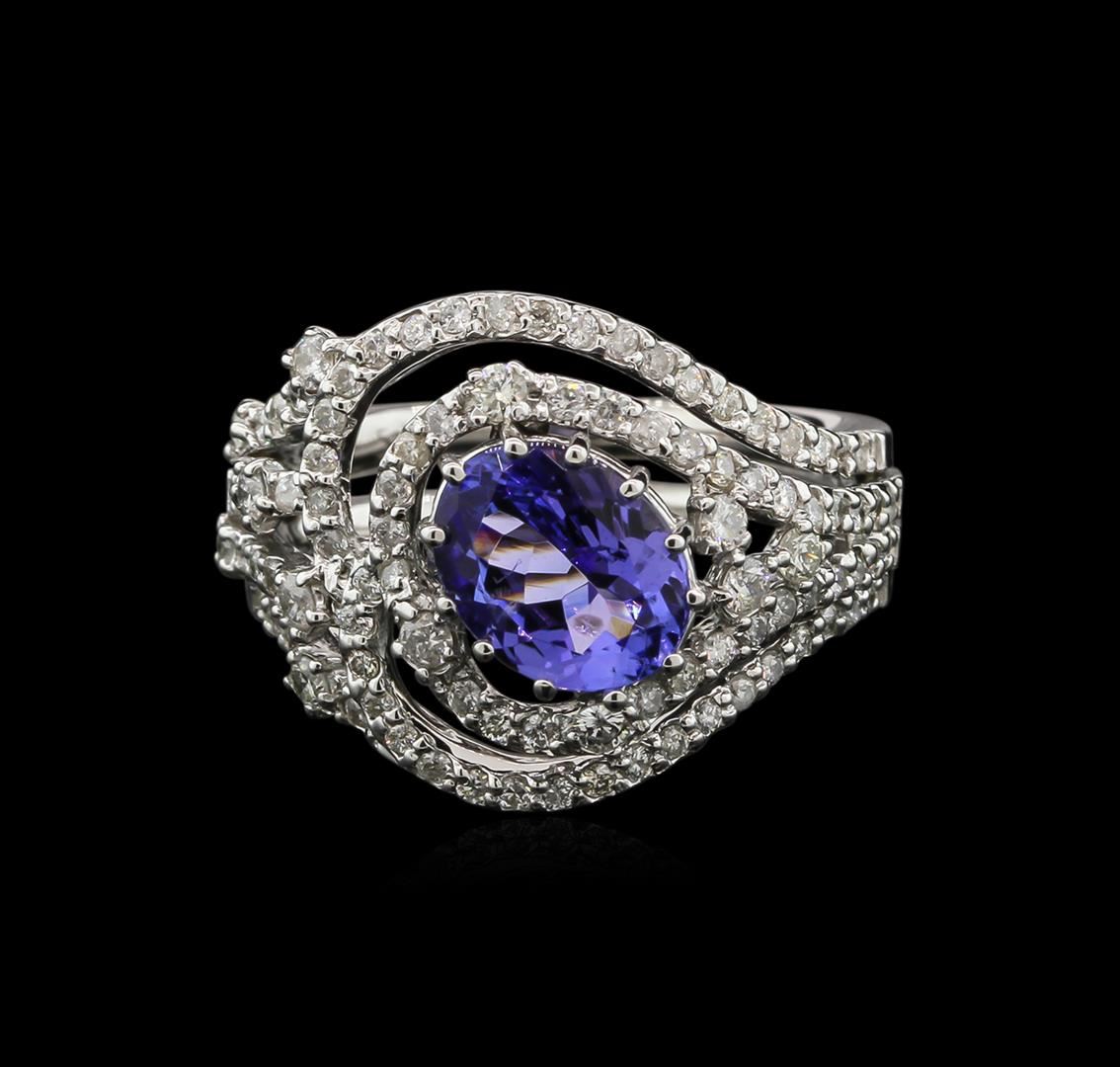 One electronically tested 14KT white gold ladies cast tanzanite and diamond ring with a bright polish finish. The featured tanzanite is set within stylized diamond bezels supported by diamond set four-way split shoulders, completed by a four millimeter wide band. Identified with markings of "585". Condition is new, good workmanship. Containing: One prong set oval mixed cut natural tanzanite exact weight 1.73ct., clarity is eye clean, type I, medium dark, very slightly grayish, bluish violet color, (GIA bV 6/3), cut is good. Transmitting light with no distortion, transparent. Graded in the setting. Tanzanite is a very rare gemstone that is only found in the country of Tanzania. Originally discovered in 1967. Tiffany & Company, named the stone Tanzanite. It is found in the Usumburu Mountains that border the Umba Valley of northern Tanzania. Tanzanite occurs in gray, brown, violet, blue, reddish-purple, & green. The gem is interesting because of its exceptional pleochroism. Rotated in different directions a tanzanite will exhibit multiple changes of color. Tanzanite has a low tolerance to ultrasonic cleaning, and should not be cleaned using this method. Ninety-Six prong set round brilliant cut diamonds (depth est.) exact total weight 96 Stones = 0.82ct. Graded in the setting. Clarity: SI-2 to I-1. Color: G - I. Total Weight of Colored Stones 1.73ct. Total Weight of Diamonds 0.82ct. Total Weight of Ring 6.99gm. AIG Appraised at $7,145.00.