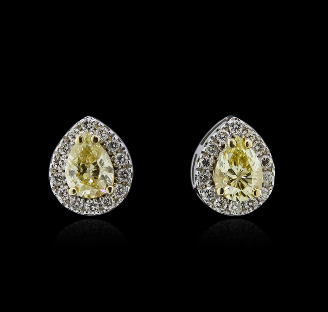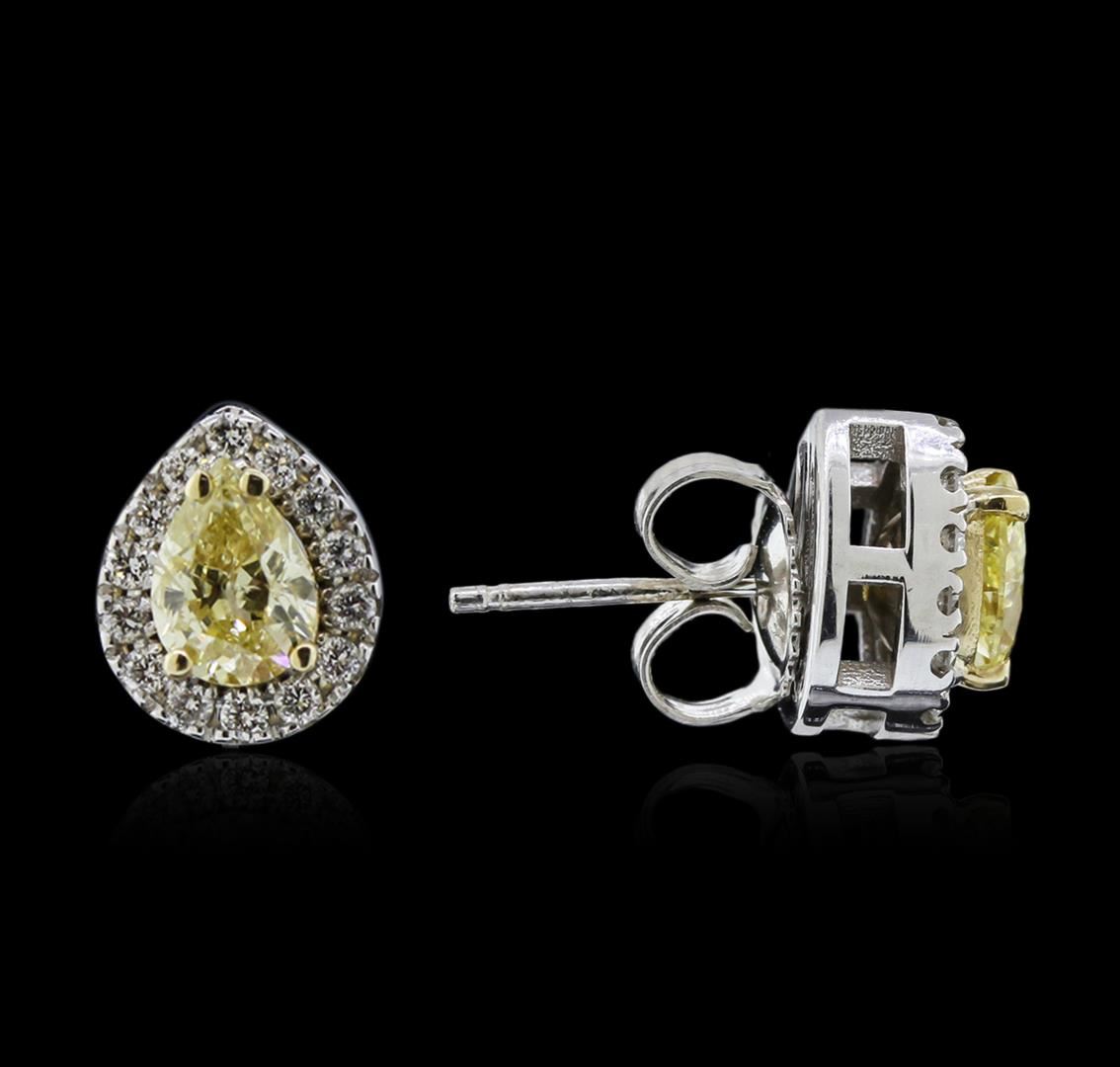 One pair electronically tested 14KT white gold ladies cast diamond earrings with friction posts with a bright polish finish. Identified with markings of "14K". Condition is new. Containing: Two prong set pear shaped cut diamonds, measuring 6.50 x 5.20 x 3 GGL Appraised at $6,885.00.