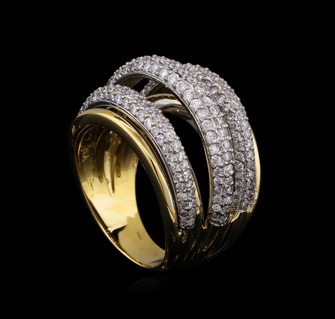 One electronically tested 14KT white and yellow gold lady's cast fashion ring with a tapered split shank with a bright polish finish. The featured lady's ring has a shank measuring 5.44 millimeters wide. Identified with markings of "K14". Condition is new, good workmanship. Containing: Two Hundred Fifty prong set round brilliant cut diamonds, measuring 1.40 - 1.10 x 0.75mm (depth est.) approximate total weight of 250 Stones = 1.74ct. Graded in the setting. Clarity: SI-1 to I-1. Color: H - I. Cut Good. Total Weight of Diamonds 1.74ct. Total Weight of Ring 10.60gm. GAS Appraised at $8,095.00.
