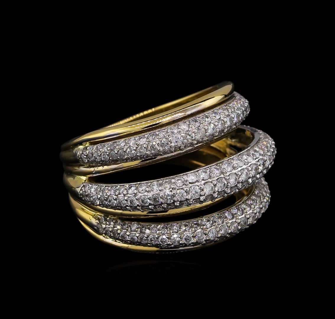 One electronically tested 14KT white and yellow gold lady's cast fashion ring with a tapered split shank with a bright polish finish. The featured lady's ring has a shank measuring 5.44 millimeters wide. Identified with markings of "K14". Condition is new, good workmanship. Containing: Two Hundred Fifty prong set round brilliant cut diamonds, measuring 1.40 - 1.10 x 0.75mm (depth est.) approximate total weight of 250 Stones = 1.74ct. Graded in the setting. Clarity: SI-1 to I-1. Color: H - I. Cut Good. Total Weight of Diamonds 1.74ct. Total Weight of Ring 10.60gm. GAS Appraised.