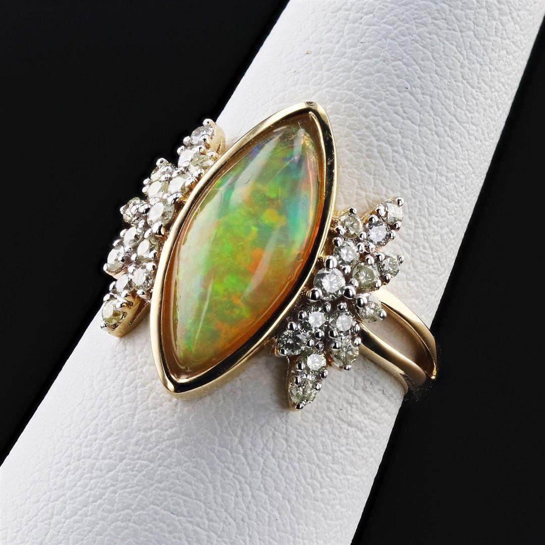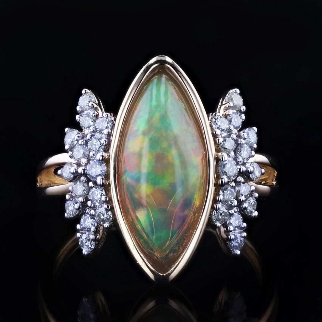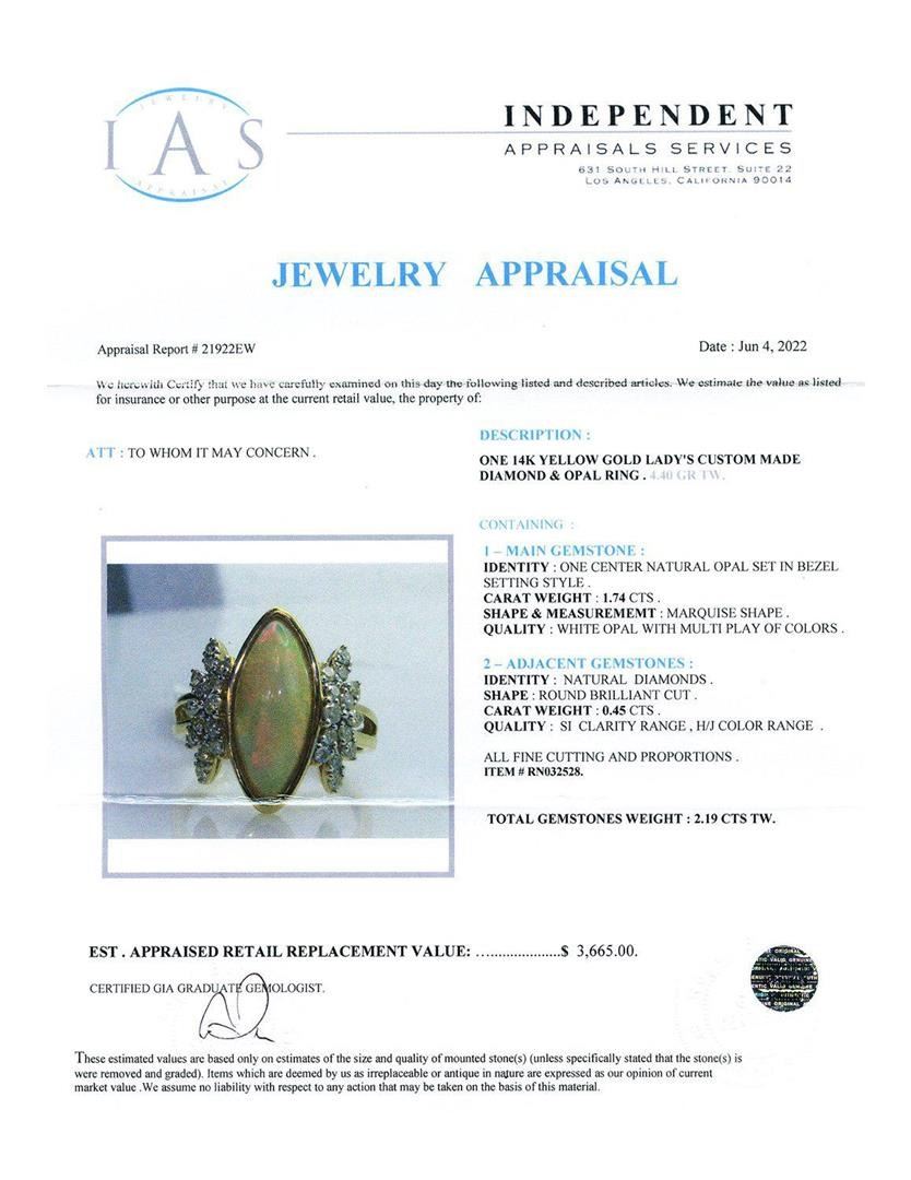 1.74ct Opal and 0.45ctw Diamond 14K Yellow Gold Ring. ONE 14K YELLOW GOLD LADY'S CUSTOM MADE DIAMOND & OPAL RING *MAIN GEMSTONE* IDENTITY: ONE CENTER NATURAL OPAL SET IN BEZEL SETTING STYLE CARAT WEIGHT: 1.74 CTS SHAPE & MEASUREMEMT: MARQUISE SHAPE QUALITY: WHITE OPAL WITH MULTI PLAY OF COLORS *ADJACENT GEMSTONES* IDENTITY: NATURAL DIAMONDS SHAPE: ROUND BRILLIANT CUT CARAT WEIGHT: 0.45 CTS QUALITY: SI CLARITY RANGE , H/J COLOR RANGE ALL FINE CUTTING AND PROPORTIONS ITEM RNO32528
