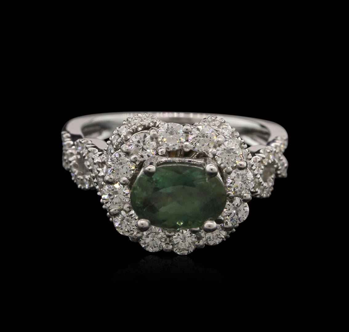 One electronically tested 18KT white gold ladies cast alexandrite and diamond ring with a bright polish finish. The featured alexandrite is set within a diamond floret bezel supported by intertwining diamond set shoulders, completed by a two and one-half millimeter wide band. Identified with markings of "18K". Condition is good. Containing: One prong set oval mixed cut natural alexandrite, measuring 8.40 x 5.80 x 4.20mm, 6% bulge factor, approximate weight of 1.74ct., clarity is heavily included, type II, medium dark, slightly grayish, slightly yellowish green color, (GIA slyG 6/2) to medium, very slightly grayish, slightly purplish red, (GIA slpR 5/3), cut is good. Transmitting light somewhat diffusely, translucent. Naturally occurring internal & external characteristics are present. Graded in the setting. Alexandrite was discovered in the 1830's near the Tokovaya River in the Ural Mountains of Siberian Russia. It later became the national gemstone of Russia. The name "alexandrite" became official in 1842.Alexandrite is a variety of chrysoberyl. It contains both beryllium and chromium. It is the chromium that accounts for the spectacular color change. The color change is the primary qualification for a chrysoberyl to be considered alexandrite. Alexandrite is strongly trichroic. Its color change results in a near-equal transmission of the blue-green and red portions of the spectrum, coupled with strong absorption in the yellow. Today Alexandrite is found in Brazil, India, Madagascar, Myanmar, Russia, Sri Lanka, Tanzania and Zimbabwe. Sixty-Eight prong set round brilliant cut diamonds approximate total weight of 68 Stones = 0.94ct. Graded in the setting. Clarity: SI-2 to I-1. Color: G - I. Total Weight of Colored Stones 1.74ct. Total Weight of Diamonds 0.94ct. Total Weight of Ring 7.52gm. AIG Appraised at $8,810.00.