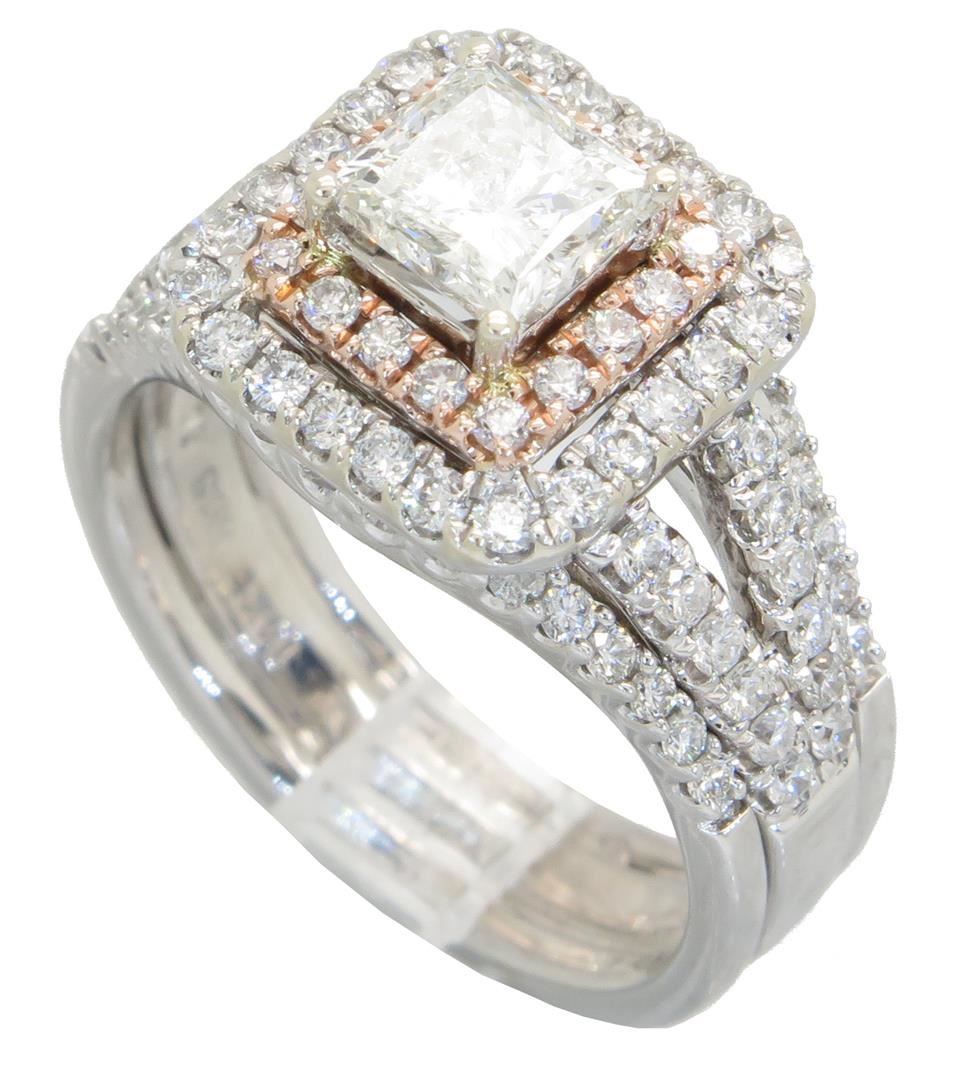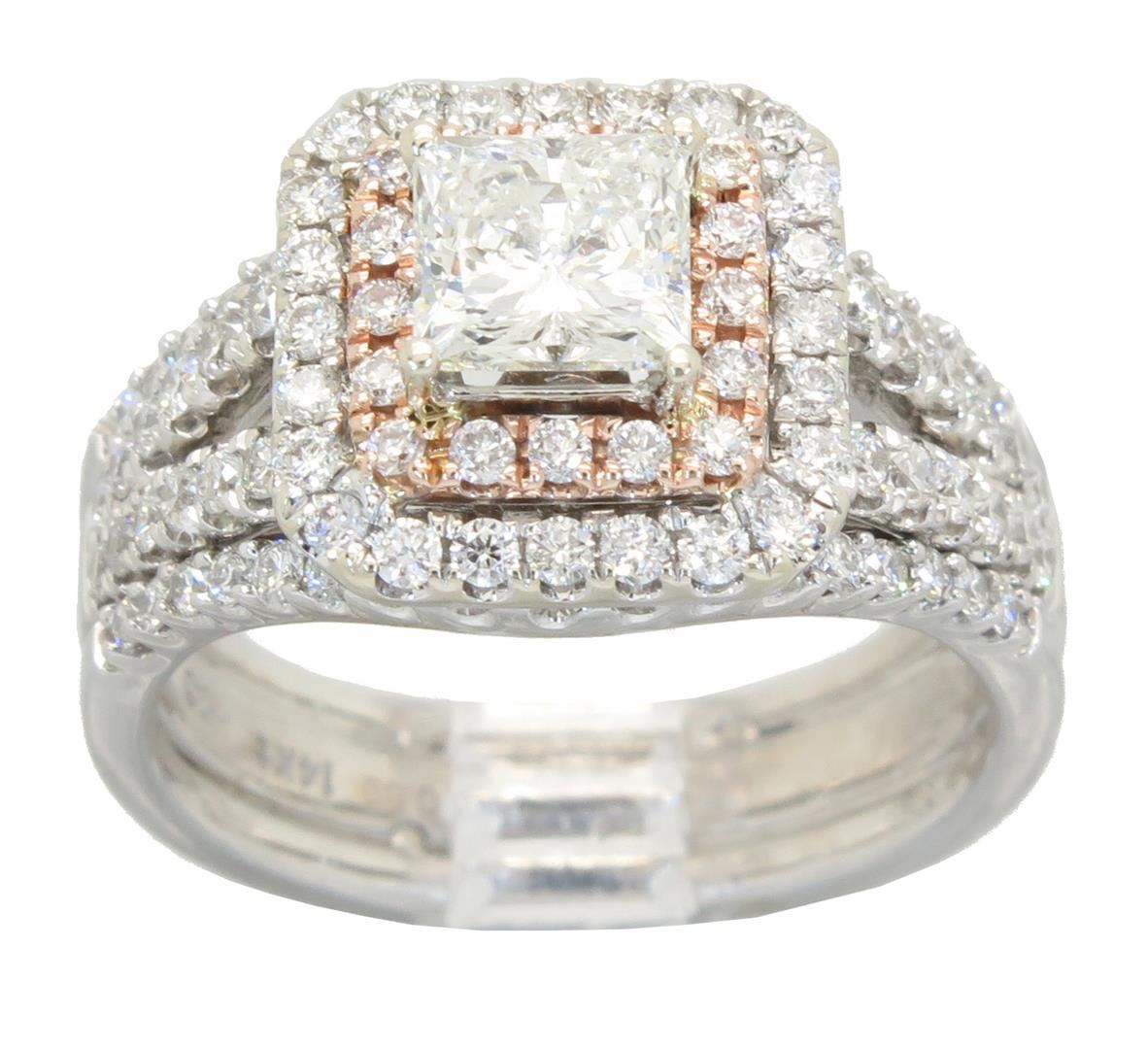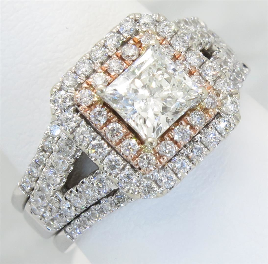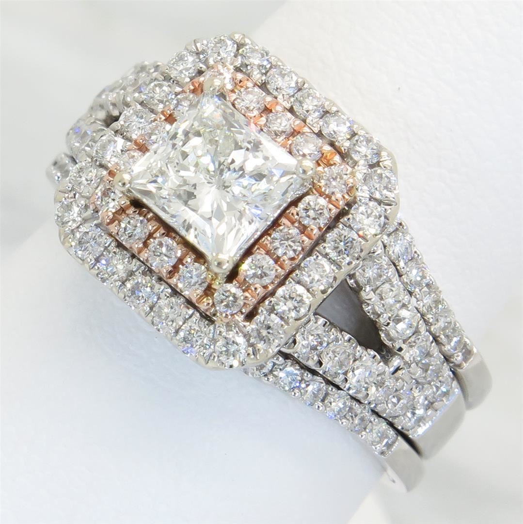 One tested 14K white and rose gold certified diamond ring. Containing: One IGI Certified Radiant Star Cut Diamond. Size: .89CT, Clarity: SI1, Color: I. 98 Round Brilliant Cut Diamonds. Approximate total diamond weight: 1.75CTW. All diamonds are graded in the mounting unless otherwise stated. Weight of ring: 8.0 grams, Size: 6.5. IGI Appraised.