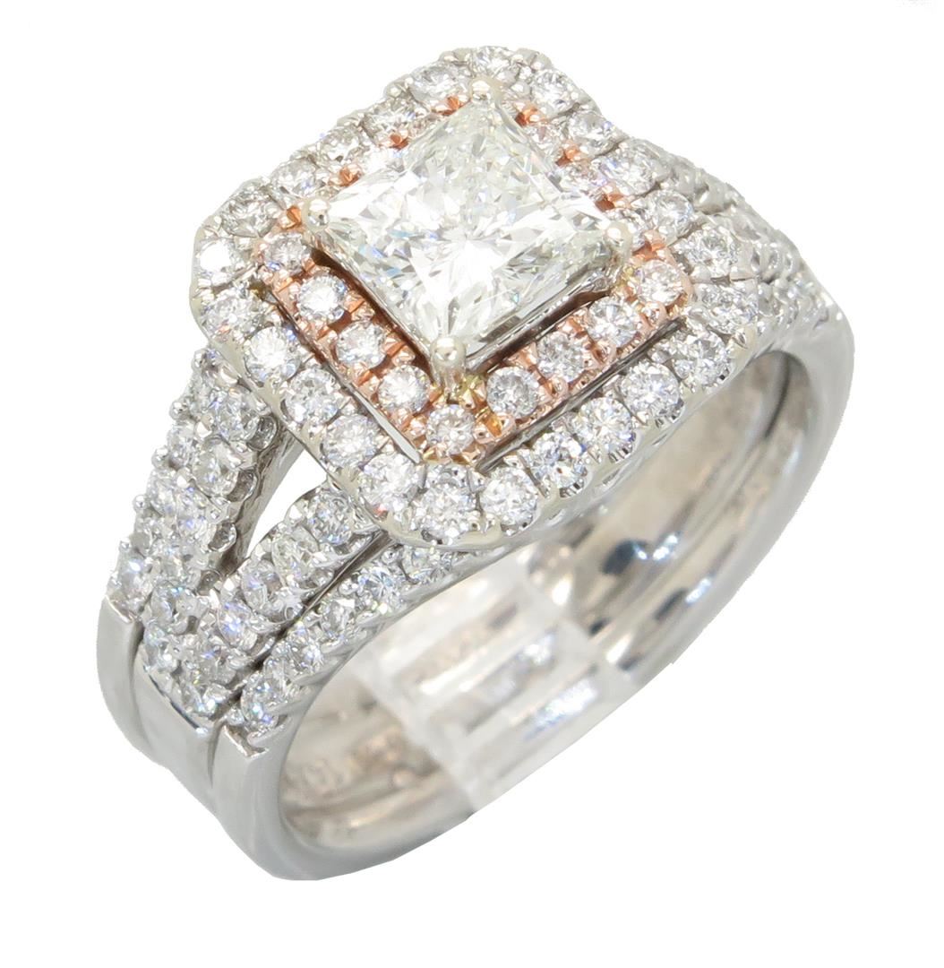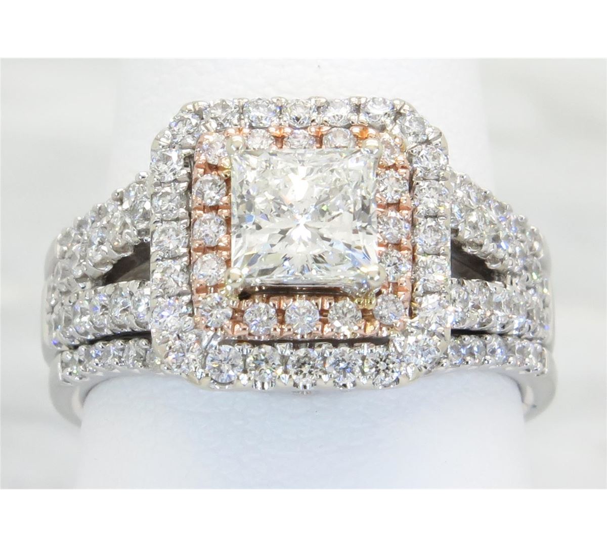 One tested 14K white and rose gold certified diamond ring. Containing: One IGI Certified Radiant Star Cut Diamond. Size: .89CT, Clarity: SI1, Color: I. 98 Round Brilliant Cut Diamonds. Approximate total diamond weight: 1.75CTW. All diamonds are graded in the mounting unless otherwise stated. Weight of ring: 8.0 grams, Size: 6.5. IGI Appraised.