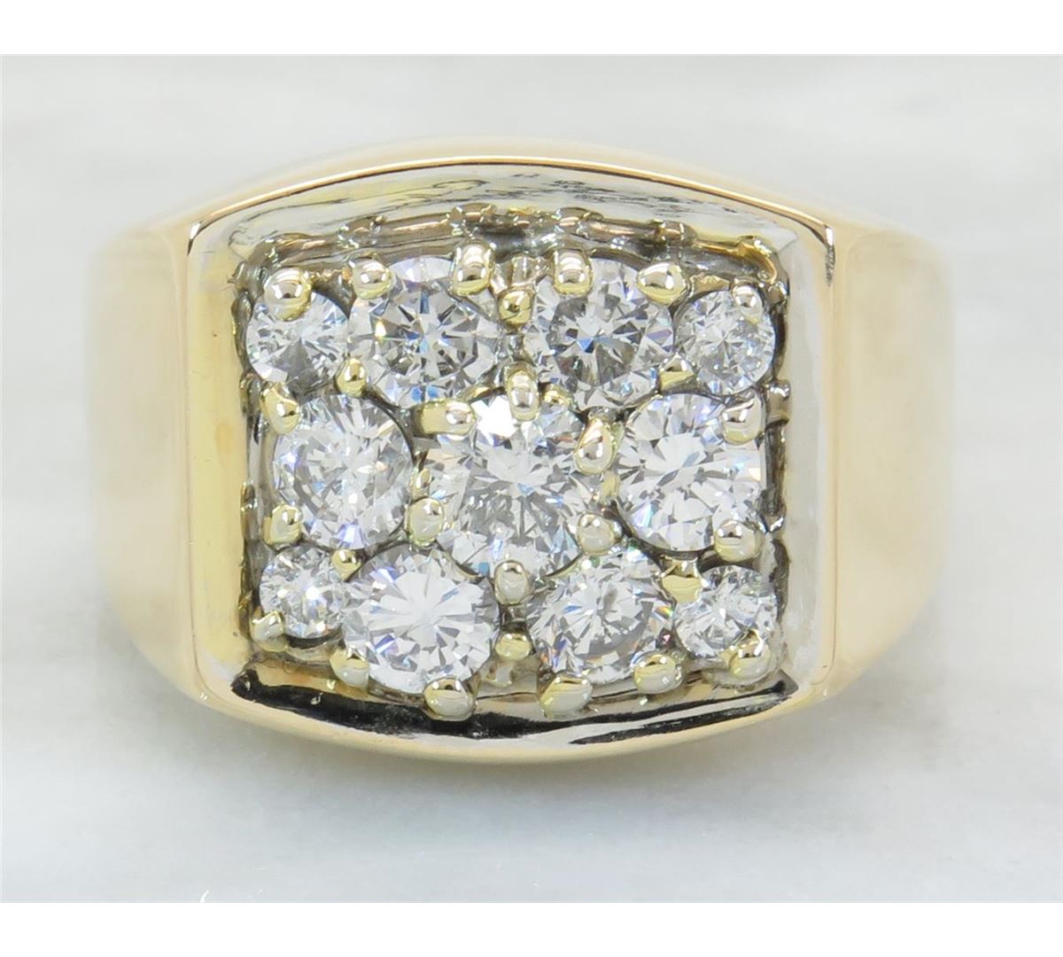 One tested 14K yellow gold diamond ring. Containing: One Round Brilliant Cut Diamond. Approximate Size: .32CT, Clarity: I, Color: G-H. 10 Round Brilliant Cut Diamonds. Approximate total diamond weight: 1.75CTW. All diamonds are graded in the mounting unless otherwise stated. Weight of ring: 10.5 grams, Size: 10.
