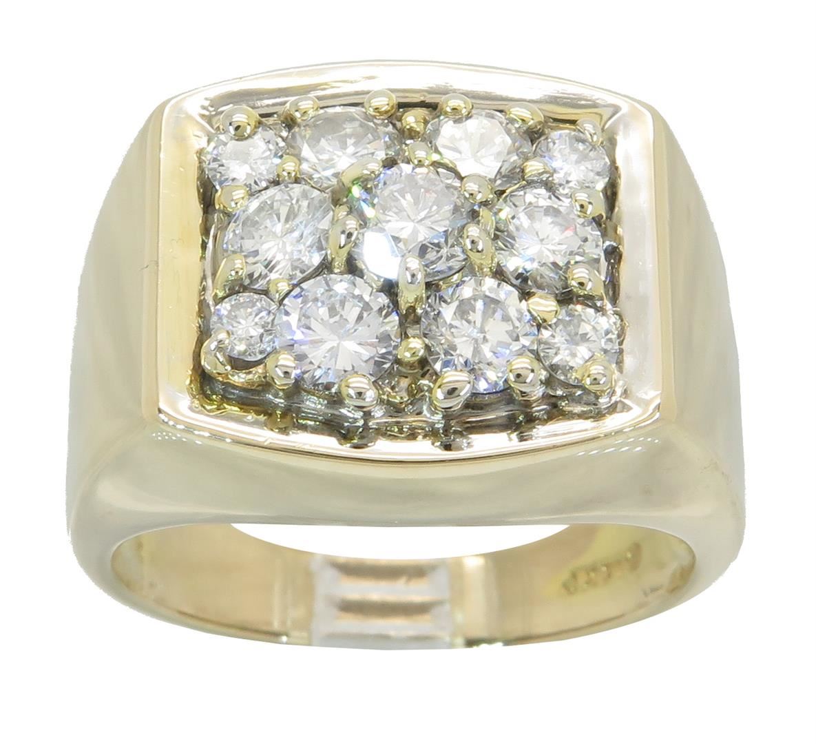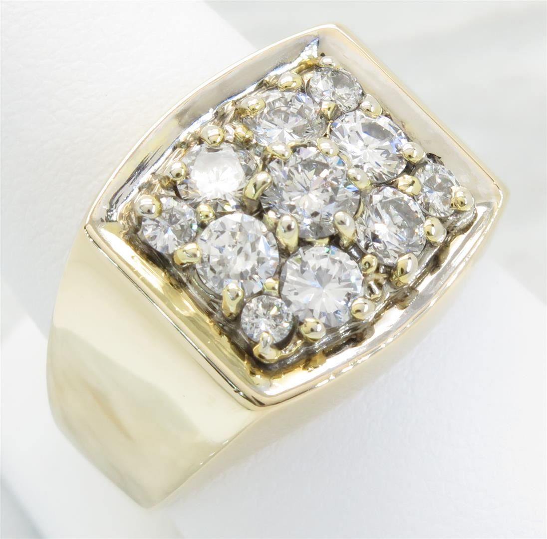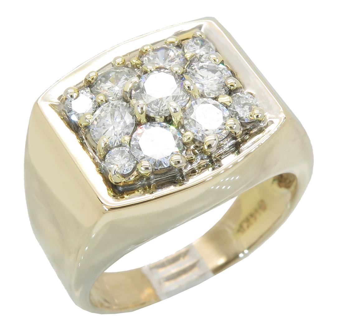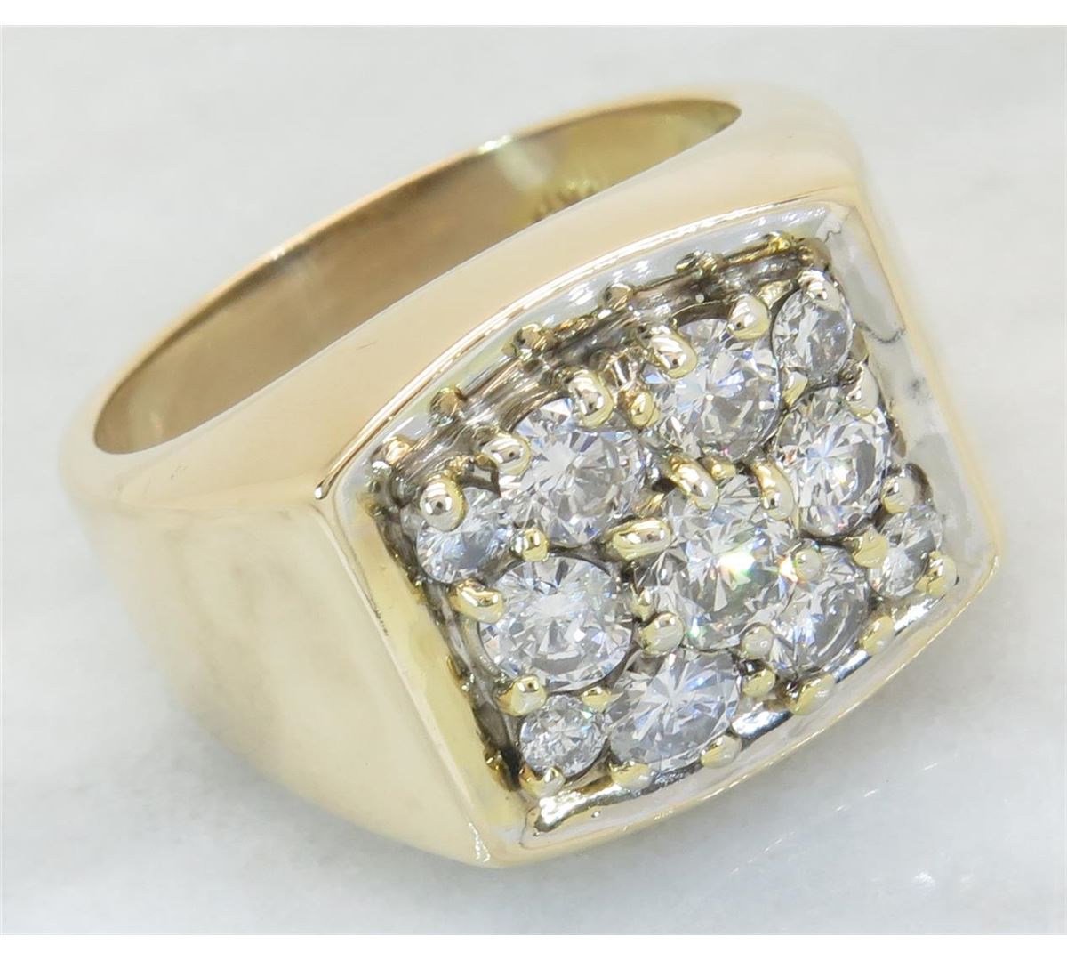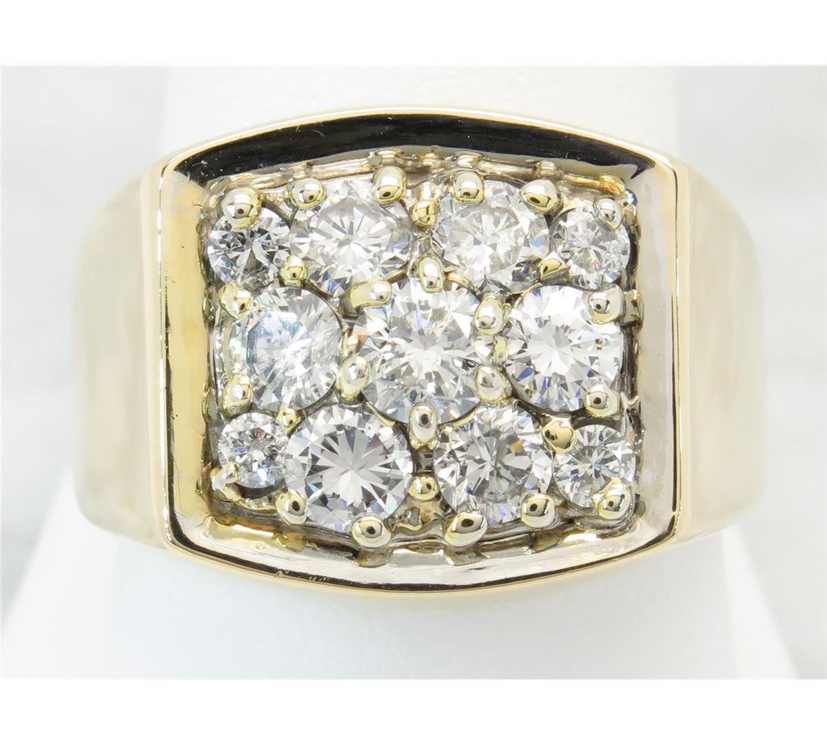 One tested 14K yellow gold diamond ring. Containing: One Round Brilliant Cut Diamond. Approximate Size: .32CT, Clarity: I, Color: G-H. 10 Round Brilliant Cut Diamonds. Approximate total diamond weight: 1.75CTW. All diamonds are graded in the mounting unless otherwise stated. Weight of ring: 10.5 grams, Size: 10.
