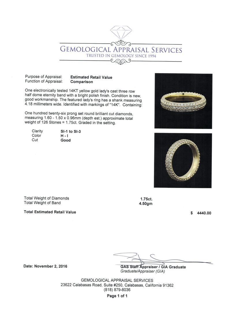 One electronically tested 14KT yellow gold lady's cast three row half dome eternity band with a bright polish finish. The featured lady's ring has a shank measuring 4.18 millimeters wide. Identified with markings of '14K'. Condition is new, good workmanship. Containing: One Hundred Twenty-Six prong set round brilliant cut diamonds, measuring 1.60 - 1.50 x 0.96mm (depth est.) approximate total weight of 126 Stones = 1.75ct. Graded in the setting. Clarity SI-1 to SI-3. Color: H - I Cut Good. Total Weight of Diamonds 1.75ct.. Total Weight of Band 4.50gm. GAS Appraised at $4,440.00.