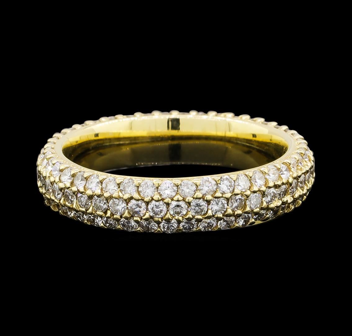 One electronically tested 14KT yellow gold lady's cast three row half dome eternity band with a bright polish finish. The featured lady's ring has a shank measuring 4.18 millimeters wide. Identified with markings of '14K'. Condition is new, good workmanship. Containing: One Hundred Twenty-Six prong set round brilliant cut diamonds, measuring 1.60 - 1.50 x 0.96mm (depth est.) approximate total weight of 126 Stones = 1.75ct. Graded in the setting. Clarity SI-1 to SI-3. Color: H - I Cut Good. Total Weight of Diamonds 1.75ct.. Total Weight of Band 4.50gm. GAS Appraised at $4,440.00.