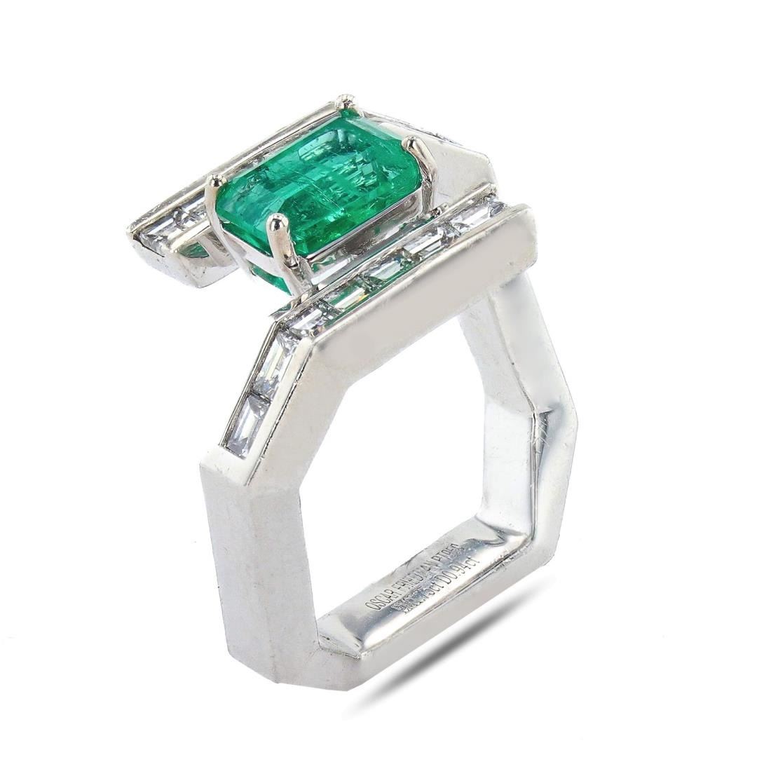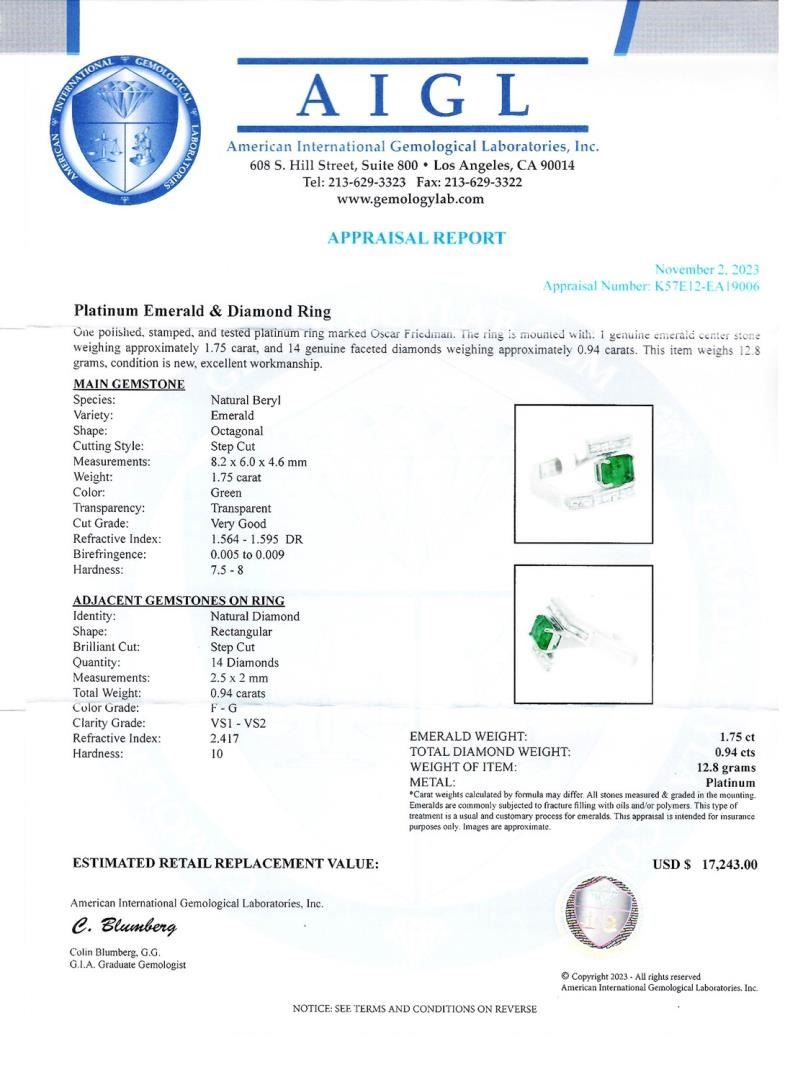 One polished, stamped, and tested platinum ring marked Oscar Friedman. The ring is mounted with: 1 genuine emerald center stone weighing approximately 1.75 carat, and 14 genuine faceted diamonds weighing approximately 0.94 carats. This item weighs 12.8 grams, condition is new, excellent workmanship. #MAIN GEMSTONE# Species: Natural Beryl; Variety: Emerald; Shape: Octagonal; Cutting Style: Step Cut; Measurements: 8.2 x 6.0 x 4.6mm; Weight: 1.75 carat; Color: Green; Transparency: Transparent; Cut Grade: Very Good; Refractive Index: 1.564 - 1.595 DR; Birefringence: 0.005 to 0.009; Hardness: 7.5 - 8 #ADJACENT GEMSTONES ON RING# Identity: Natural Diamond; Shape: Rectangular; Brilliant Cut: Step Cut; Quantity: 14 Diamonds; Measurements: 2.5 x 2mm; Total Weight: 0.94 carats; Color Grade: F-G; Clarity Grade: VS1-VS2; Refractive Index: 2.417; Hardness: 10; EMERALD WEIGHT: 1.75 ct; TOTAL DIAMOND WEIGHT: 0.94 cts; WEIGHT OF ITEM: 12.8 grams; METAL: Platinum #Size: 6 1/4