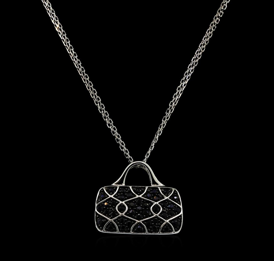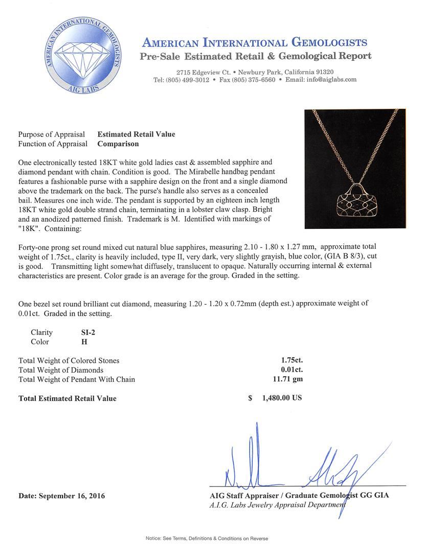 One electronically tested 18KT white gold ladies cast & assembled sapphire and diamond pendant with chain. Condition is good. The Mirabelle handbag pendant features a fashionable purse with a sapphire design on the front and a single diamond above the trademark on the back. The purse's handle also serves as a concealed bail. Measures one inch wide. The pendant is supported by an eighteen inch length 18KT white gold double strand chain, terminating in a lobster claw clasp. Bright and an anodized patterned finish. Trademark is M. Identified with markings of 18K. Containing: Forty-one prng set round mixed cut natural blue sapphires, measuring 2.10 - 1.80 x 1.27mm, approximate total weight of 1.75ct., clarity is heavily included, type II, very dark, very slightly grayish, blue color, (GIA B 8/3), cut is good. Transmitting light somewhat diffusely, translucent to opaque. Naturally occurring internal & external characteristics are present. Color grade is an average for the group. Graded in the setting. One bezel set round brilliant cut diamond, measuring 1.20 - 1.20 x 0.72mm (depth est.) approximate weight of 0.01ct. Graded in the setting. Color: SI-2. Color: H. Total Weight of Colored Stones 1.75ct. Total Weight of Diamonds 0.01ct. Total Weight of Pendant With Chain 11.71 grams. AIG Appraised at $1,480.00.