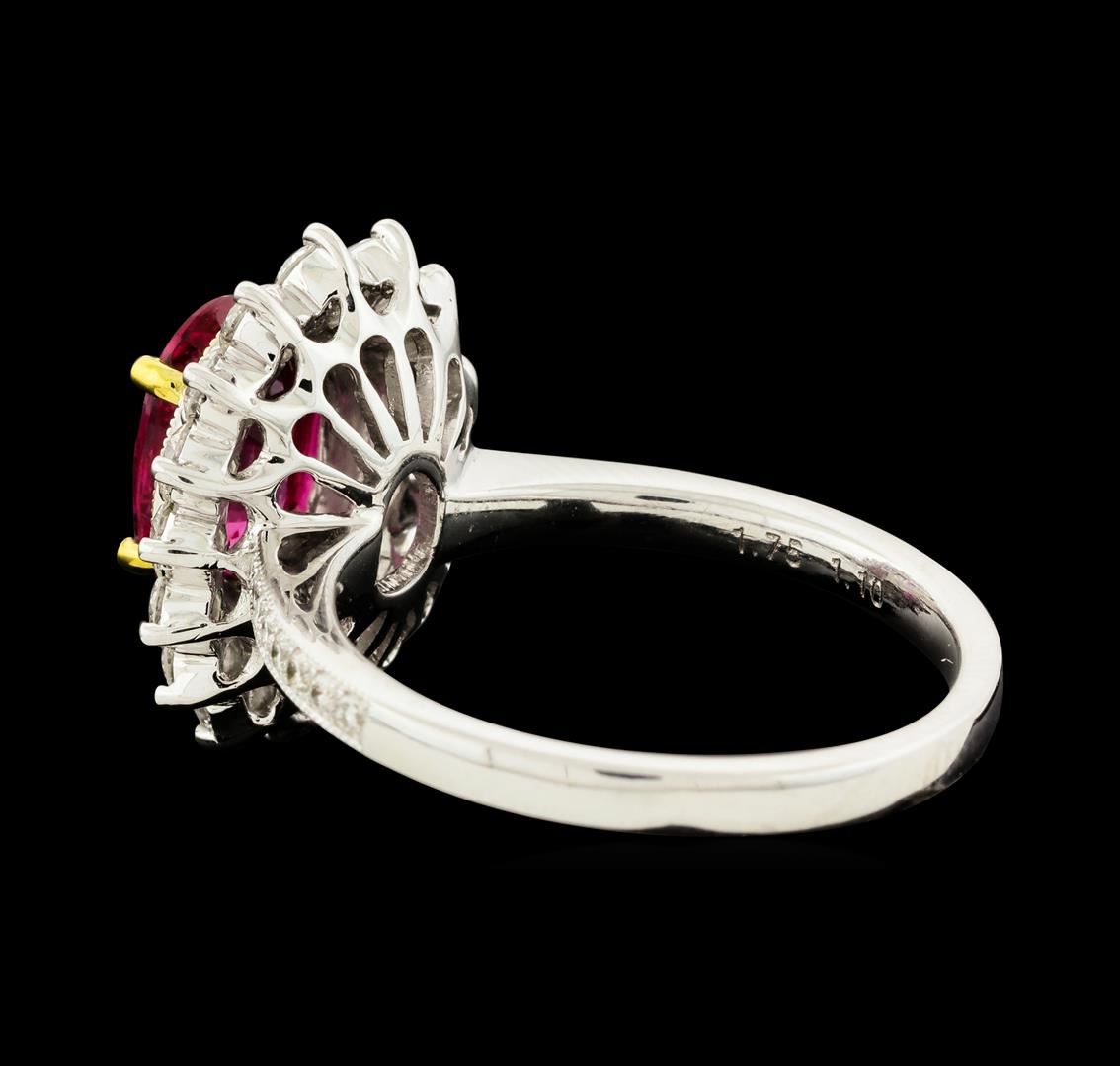 One electronically tested 18KT white gold lady's combination cast & assembled fashion ring with a double basket halo with a bright polish with milgrain detailing finish. The featured lady's ring has yellow gold plating on the center halo and prongs and has a shank measuring 2.15 millimeters wide. Identified with markings of '750'. Condition is new, good workmanship. Containing: One prong set oval modified mixed cut natural pink sapphire, measuring 8.73 x 5.63 x 3.68mm, (depth est.) 15%. bulge factor, approximate weight of 1.75ct., clarity is slightly included, medium light, strong, strongly purplish red color, (GIA stpR 4/5), cut is good. Transmitting light with a minimum of distortion, transparent. Colored gemstones are presumed to have been subjected to commonly used enhancement processes. Graded in the setting. Sixteen prong set round brilliant cut diamonds, measuring 2.40 - 2.35 x 1.48mm (depth est.) approximate total weight of 16 Stones = 0.82ct. Graded in the setting. Clarity VS-2 to SI-1. Color: G - H Cut Good Sixteen prong set round brilliant cut diamonds, measuring 1.40 - 1.30 x 0.84mm (depth est.) approximate total weight of 16 Stones = 0.15ct. Graded in the setting. Clarity VS-2 to SI-1. Color: G - H Cut Good Twenty-Two prong set round brilliant cut diamonds, measuring 1.20 - 1.10 x 0.71mm (depth est.) approximate total weight of 22 Stones = 0.13ct. Graded in the setting. Clarity VS-2 to SI-1. Color: G - H Cut Good. Total Weight of Colored Stones 1.75ct.. Total Weight of Diamonds 1.10ct.. Total Weight of Ring 5.70gm. GAS Appraised at $9,580.00.